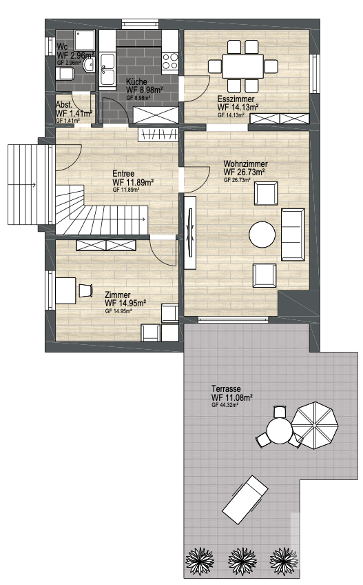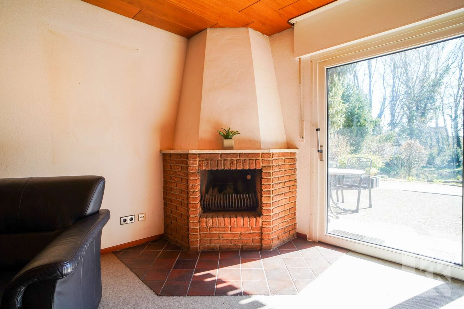 Die Immobilie verfügt über eine klare Struktur mit drei Ebenen: Keller, Erdgeschoss und Obergeschoss. Über eine Treppe gelangt man in das Erdgeschoss, wo ein Windfang in den Eingangsbereich überleitet. Von hier aus öffnet sich der Weg in den zentral gelegenen Wohnbereich, der das Herzstück des Hauses bildet. Ein fest gemauerter Kamin sorgt hier für eine angenehme Atmosphäre.