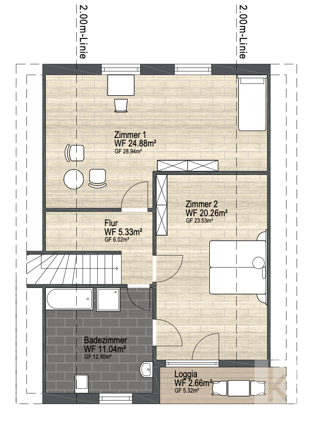 Im Obergeschoss stehen zwei großzügige Schlafzimmer zur Verfügung, eines davon mit Zugang zum Balkon und Blick ins Grüne. Die vorhandene Raumstruktur lässt sich bei Bedarf anpassen. Ergänzt wird diese Ebene durch ein Badezimmer mit Badewanne und Dusche.