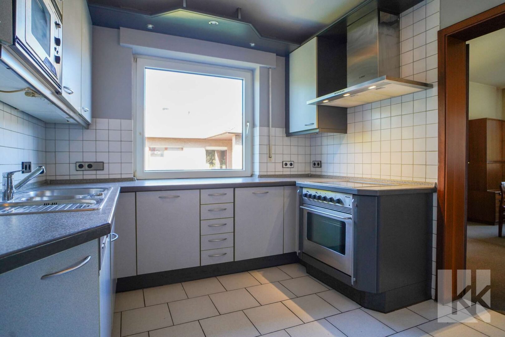 Der Wohnbereich geht fließend in den Essbereich über und schafft ein großzügiges Raumgefühl. Die Küche ist als separater Raum angelegt und liegt unmittelbar angrenzend. Vom Wohnbereich aus gelangt man auf die Terrasse mit freiem Blick über das weitläufige Grundstück bis hin zum Schwimmteich.