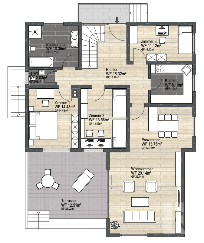 Bereits beim Betreten zeigt sich die klare Aufteilung. Vom Eingangsbereich aus erschließt sich linker Hand ein Raum, der sich ideal als Homeoffice oder Gästezimmer nutzen lässt. Angrenzend befindet sich die Küche als separater Raum. Von hier aus gelangt man in den Essbereich, der über eine Durchreiche mit der Küche verbunden ist und fließend in den großzügigen Wohnbereich übergeht.