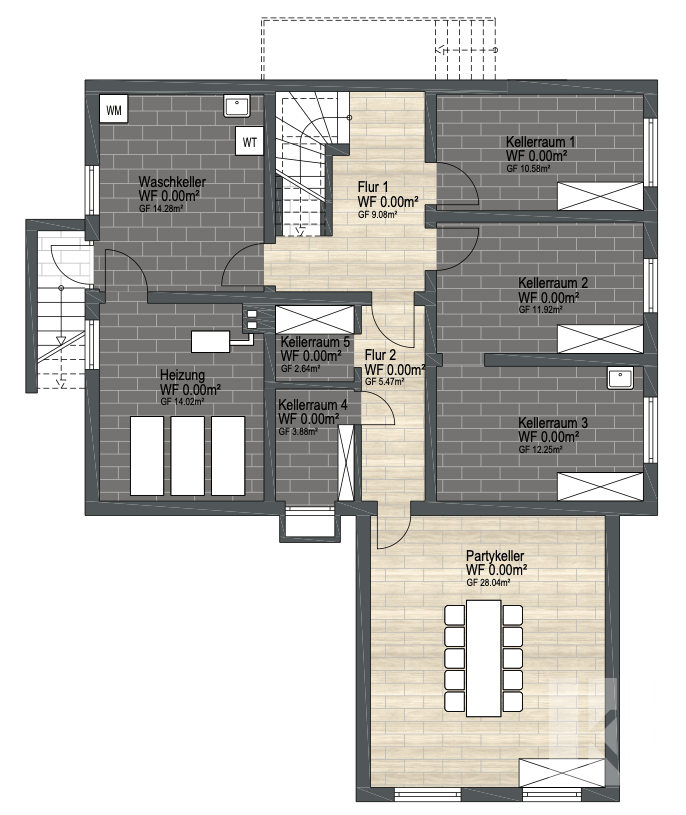 Das Haus ist vollunterkellert und bietet neben Abstellflächen und dem Heizungsraum auch einen großzügigen Partykeller.
