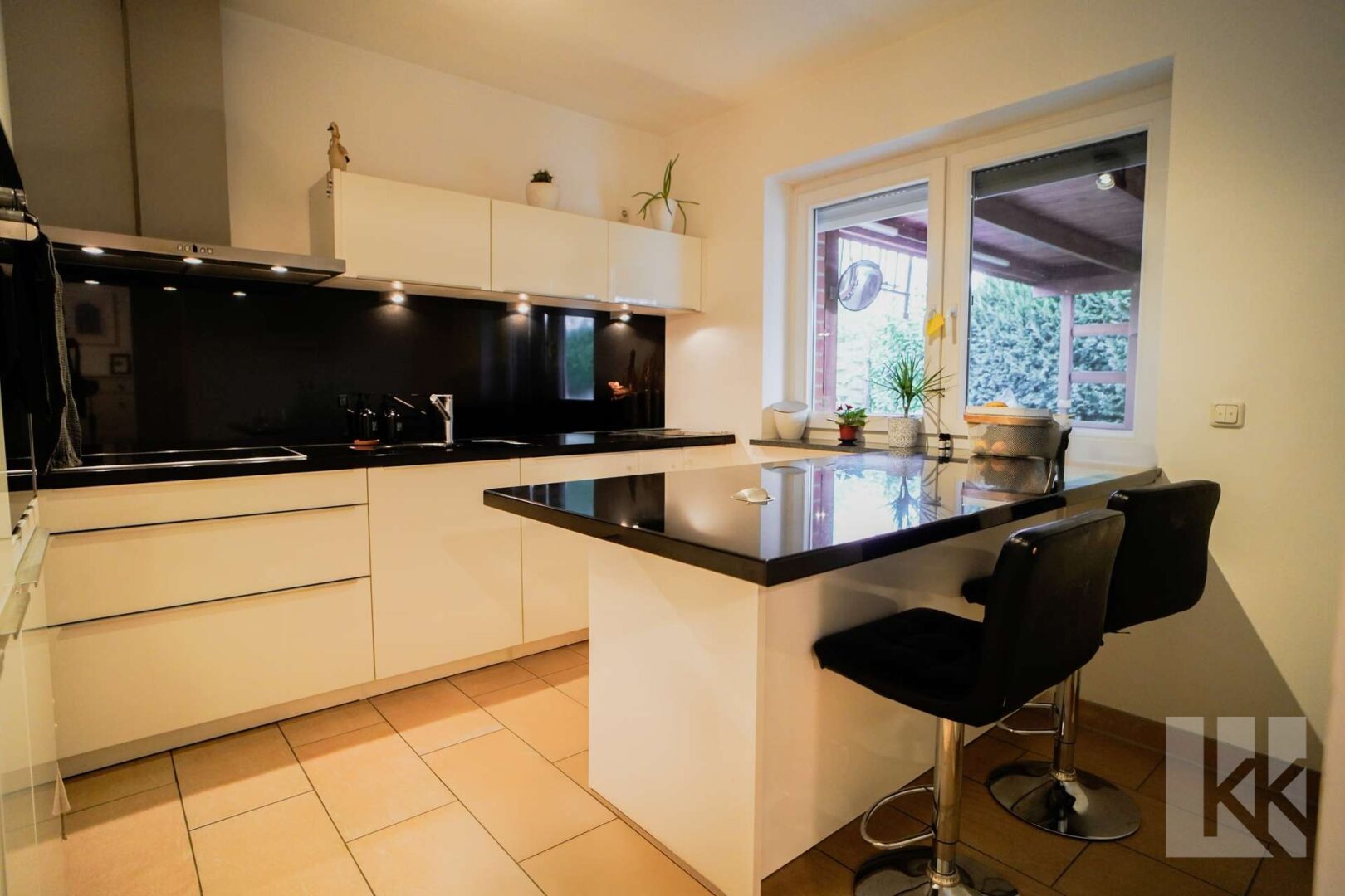 Schon beim Betreten empfängt Sie ein geschmackvoll gestalteter Eingangsbereich mit Platz für eine Garderobe. Von hier aus gelangen Sie in das Gäste-WC sowie die geschlossene Küche, die mit viel Stauraum und einer durchdachten Aufteilung überzeugt – ein Paradies für Hobbyköche und Backkünstler. Der gegenüberliegende Wohn- und Essbereich beeindruckt mit seiner Offenheit und schafft eine gemütliche Atmosphäre mit direktem Blick in den Garten.