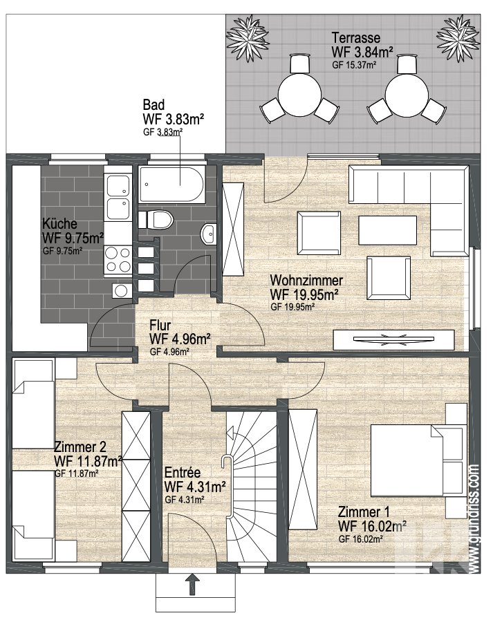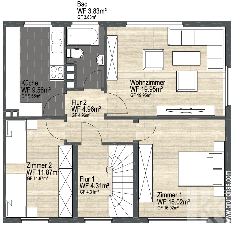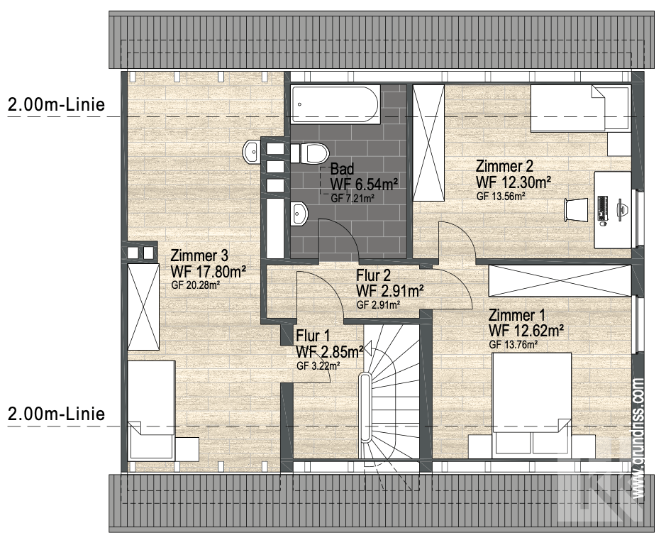 Das Obergeschoss greift die Raumaufteilung des Erdgeschosses auf und bietet damit drei zusätzliche Wohn- oder Schlafräume. Ob als klassisches Einfamilienhaus, Mehrgenerationenlösung oder mit separatem Arbeitsbereich – die Nutzungsmöglichkeiten sind vielfältig.