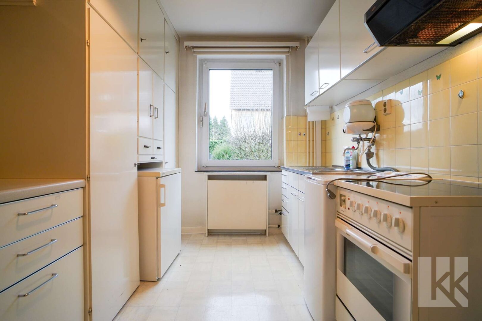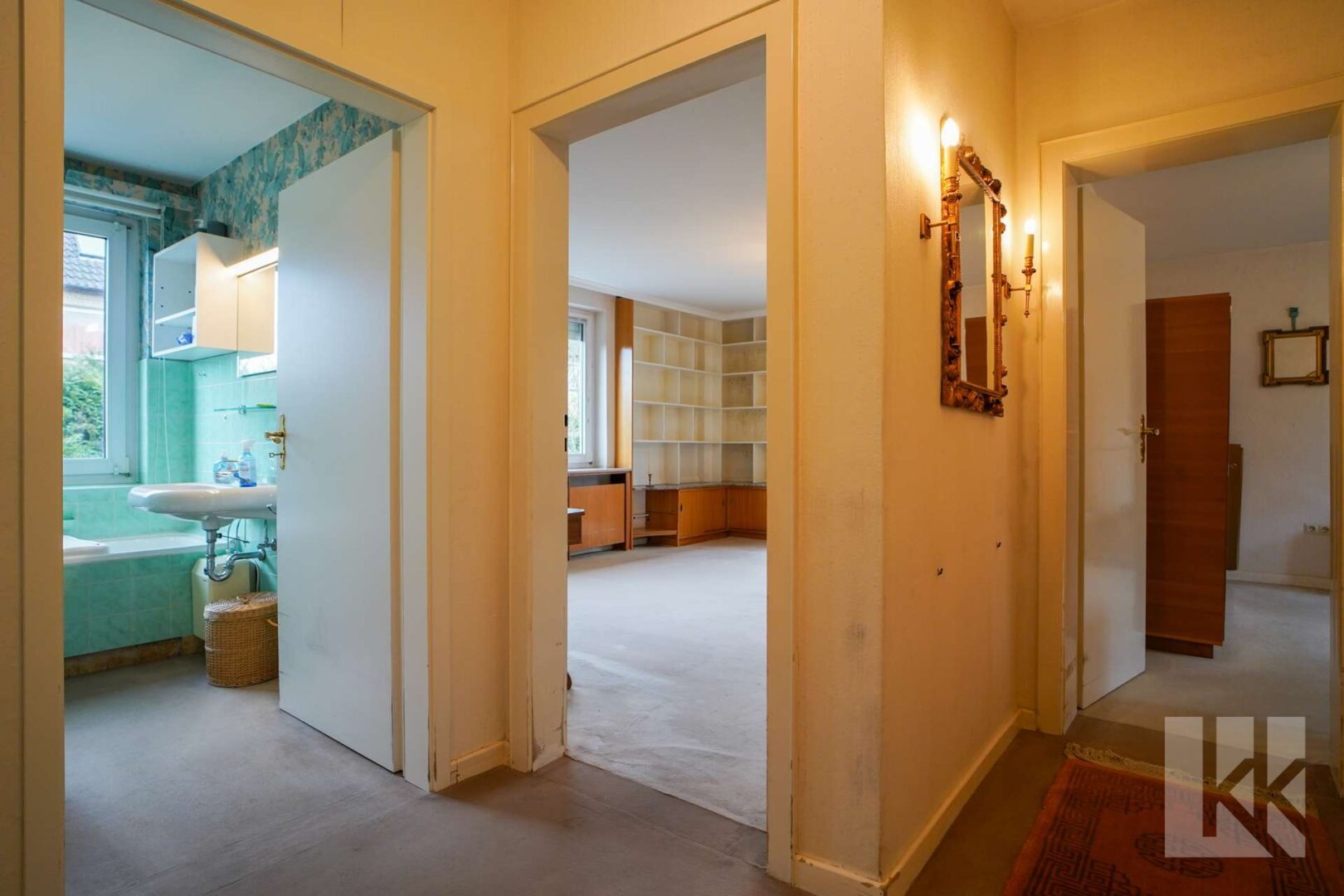 Der zentrale Eingangsbereich bildet das verbindende Element des Hauses und erschließt alle Ebenen – vom Keller bis ins Dachgeschoss. Die klare Grundstruktur bietet dabei eine Grundlage für zukünftige Grundrisslösungen. Im Erdgeschoss befindet sich der Hauptwohnbereich mit einem Wohnzimmer und direktem Zugang zur Terrasse und in den Garten. Ergänzt wird diese Ebene durch zwei weitere Räume sowie die Küche und ein Badezimmer – mit viel Spielraum für eine moderne, offene Neugestaltung.