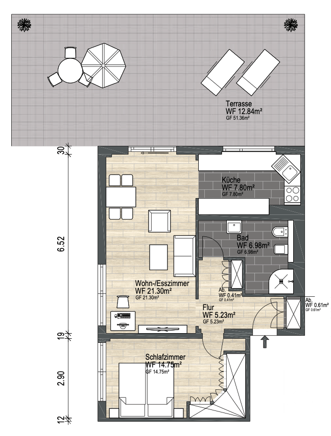 Die Terrasse erweitert den Wohnraum spürbar ins Freie. Ob Frühstück in der Morgensonne, Kräutertöpfe oder entspannte Abende – der angrenzende Gartenanteil verleiht der Wohnung eine fast hausähnliche Qualität.