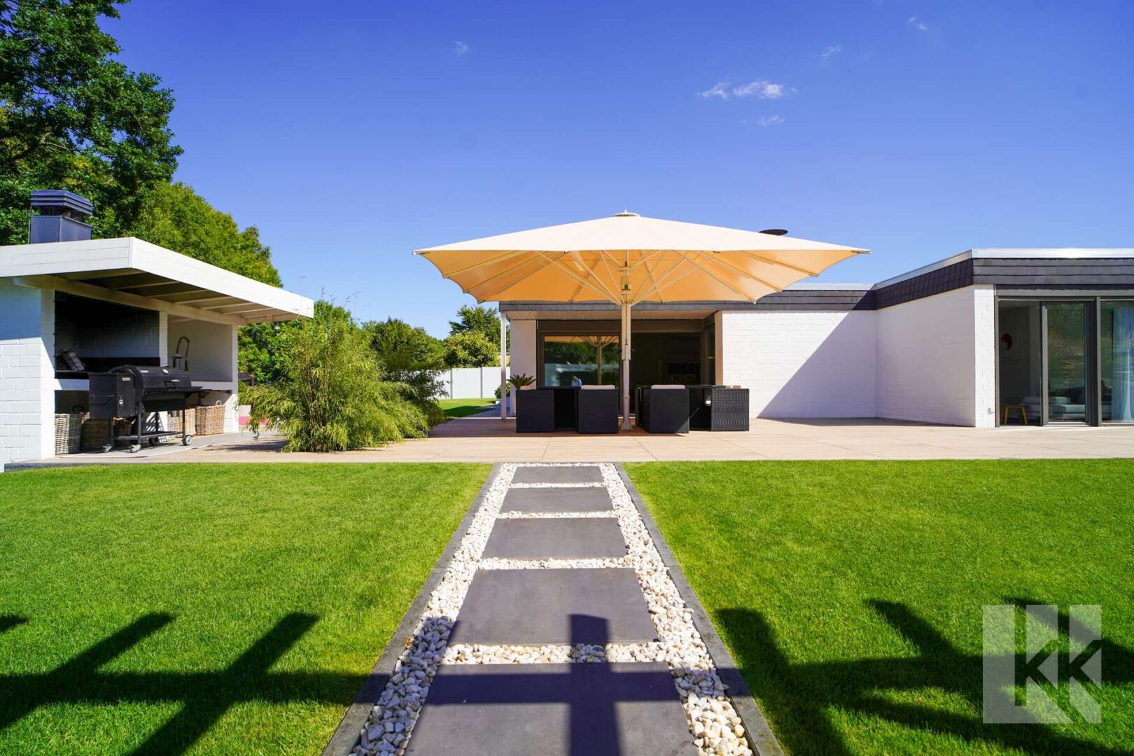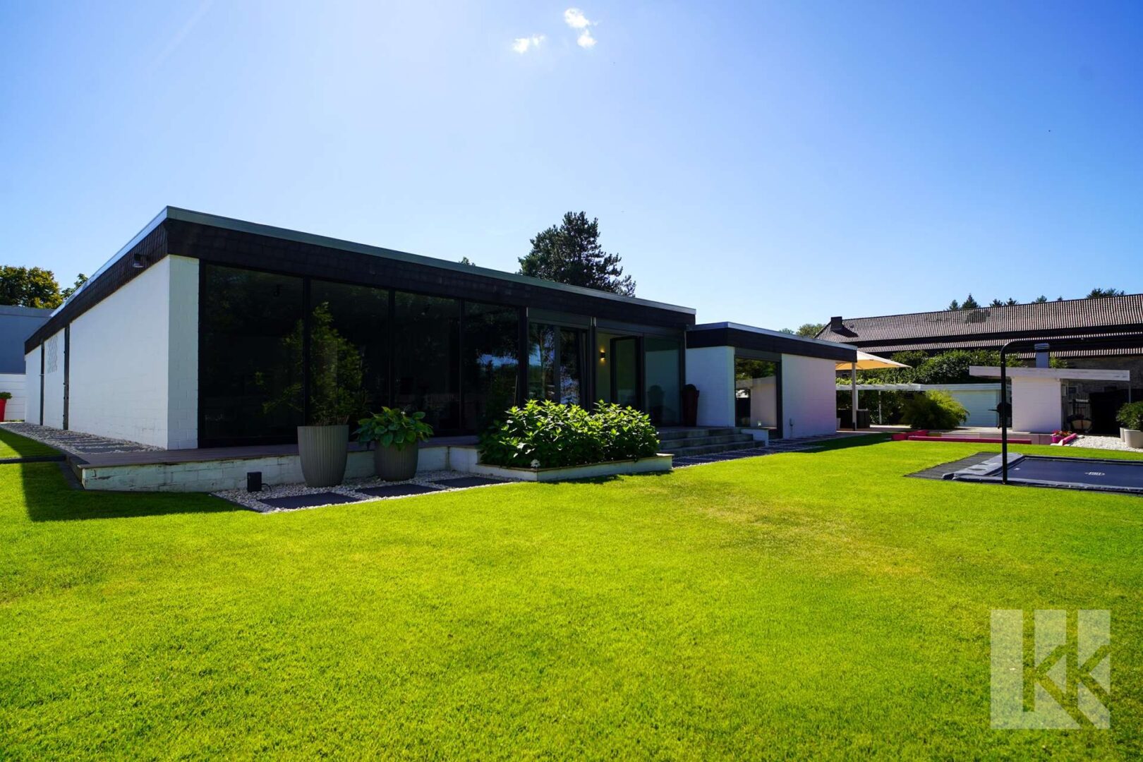 Die Ausstattung erfüllt höchste Ansprüche: Eine exklusive Designküche, ein eleganter Kamin, modernste Smart-Home-Technologie und ausgewählte Materialien setzen in jedem Raum besondere Akzente. Ein separater Gästetrakt mit eigenem Wohn-, Schlaf- und Badbereich bietet flexible Nutzungsmöglichkeiten – ob für Besucher, Au-Pair oder Nanny, stets perfekt integriert und dennoch diskret.
