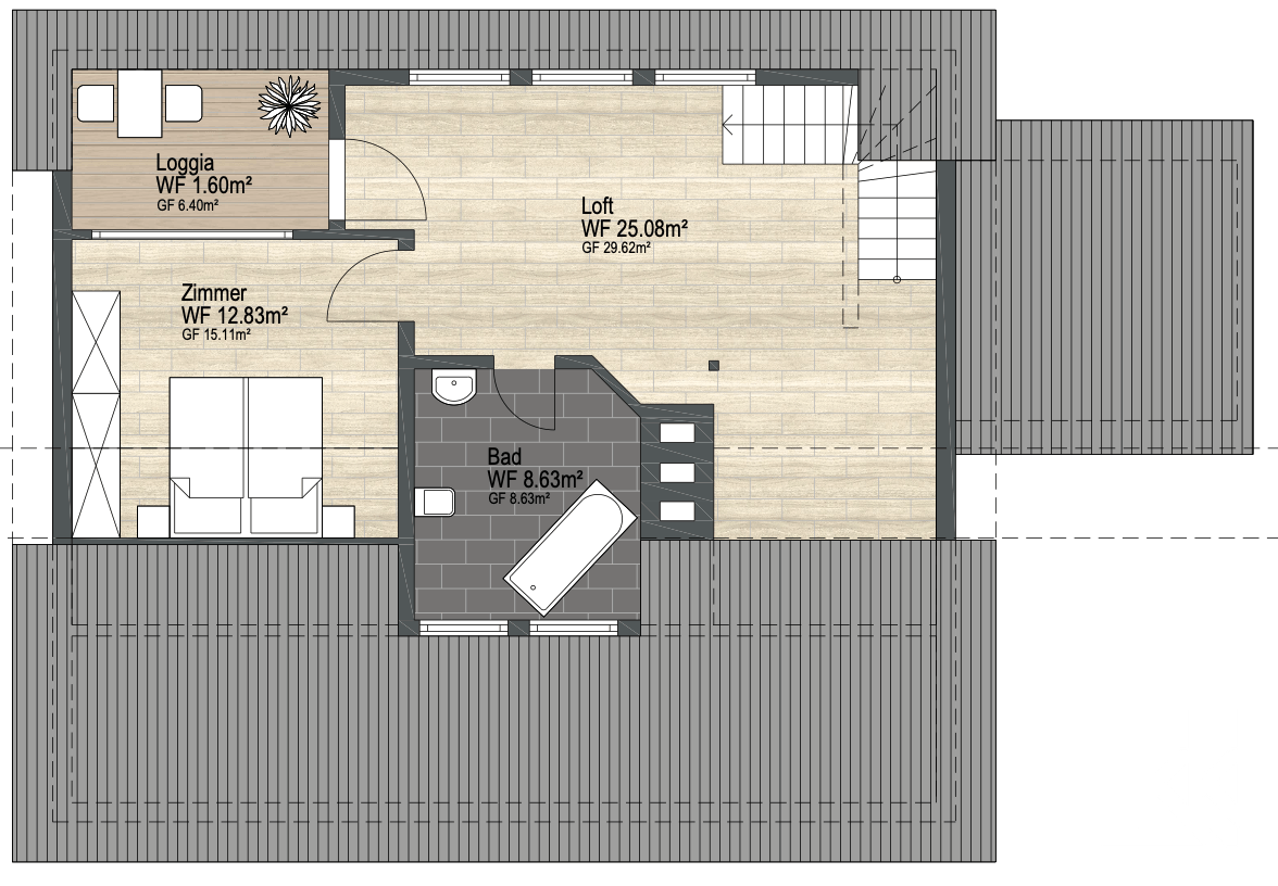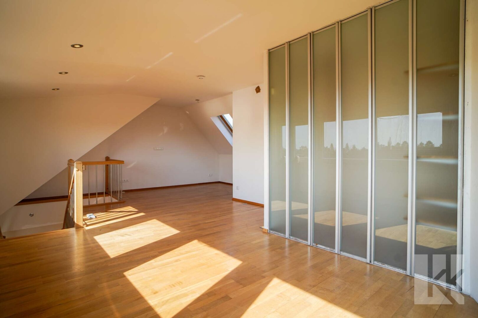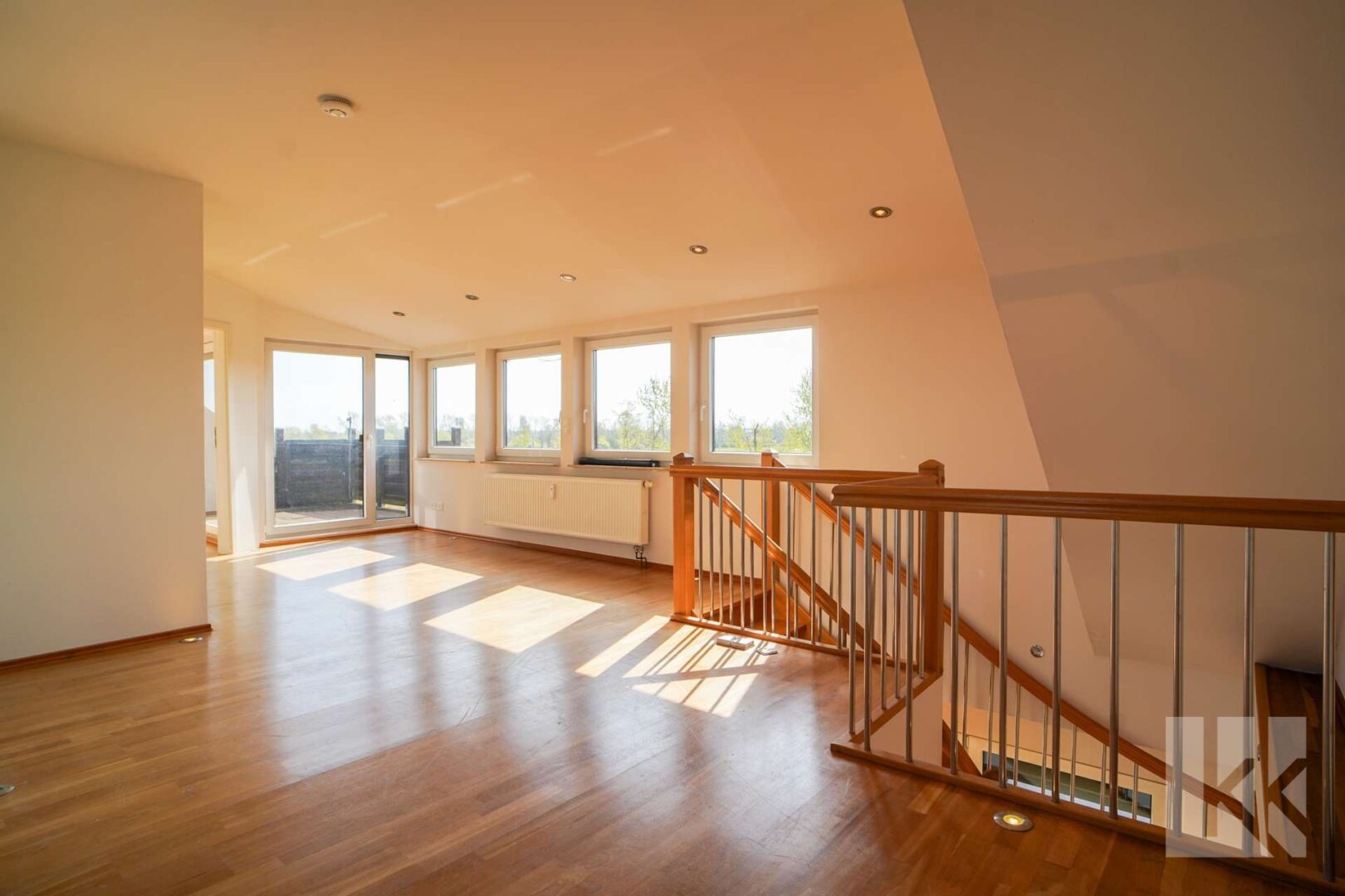 Im Dachgeschoss setzt sich das offene Raumgefühl fort. Ein weiterer Wohnbereich mit weitem Ausblick, ein zweites Badezimmer mit Badewanne sowie ein zusätzliches Schlafzimmer mit Zugang zum Balkon schaffen hier einen eigenständigen Rückzugsort.