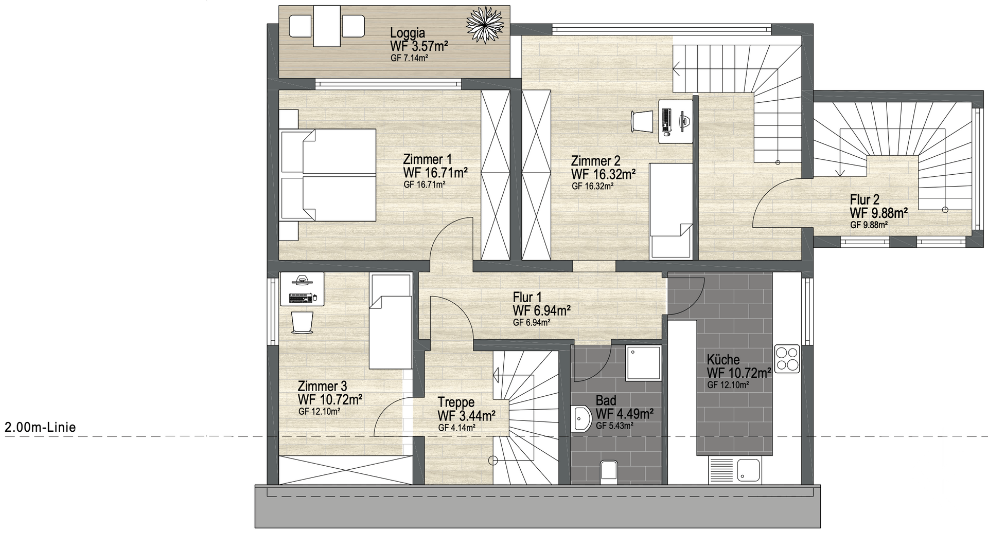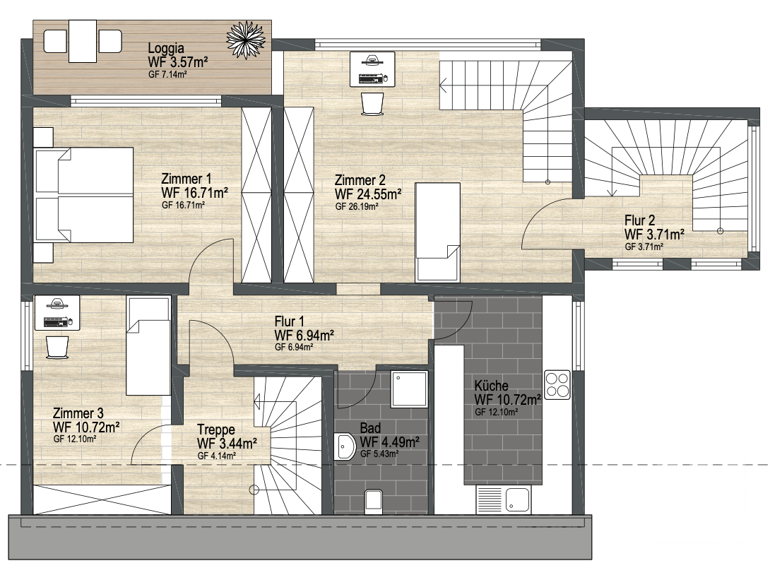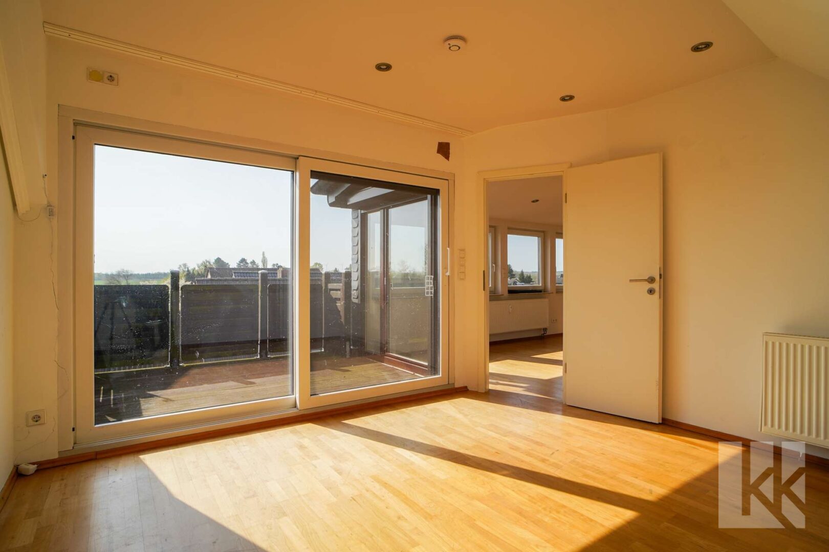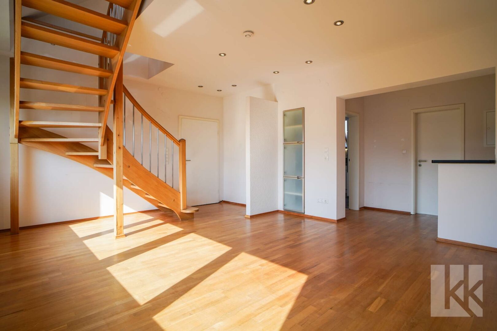 Im Dachgeschoss setzt sich das offene Raumgefühl fort. Ein weiterer Wohnbereich mit weitem Ausblick, ein zweites Badezimmer mit Badewanne sowie ein zusätzliches Schlafzimmer mit Zugang zum Balkon schaffen hier einen eigenständigen Rückzugsort.