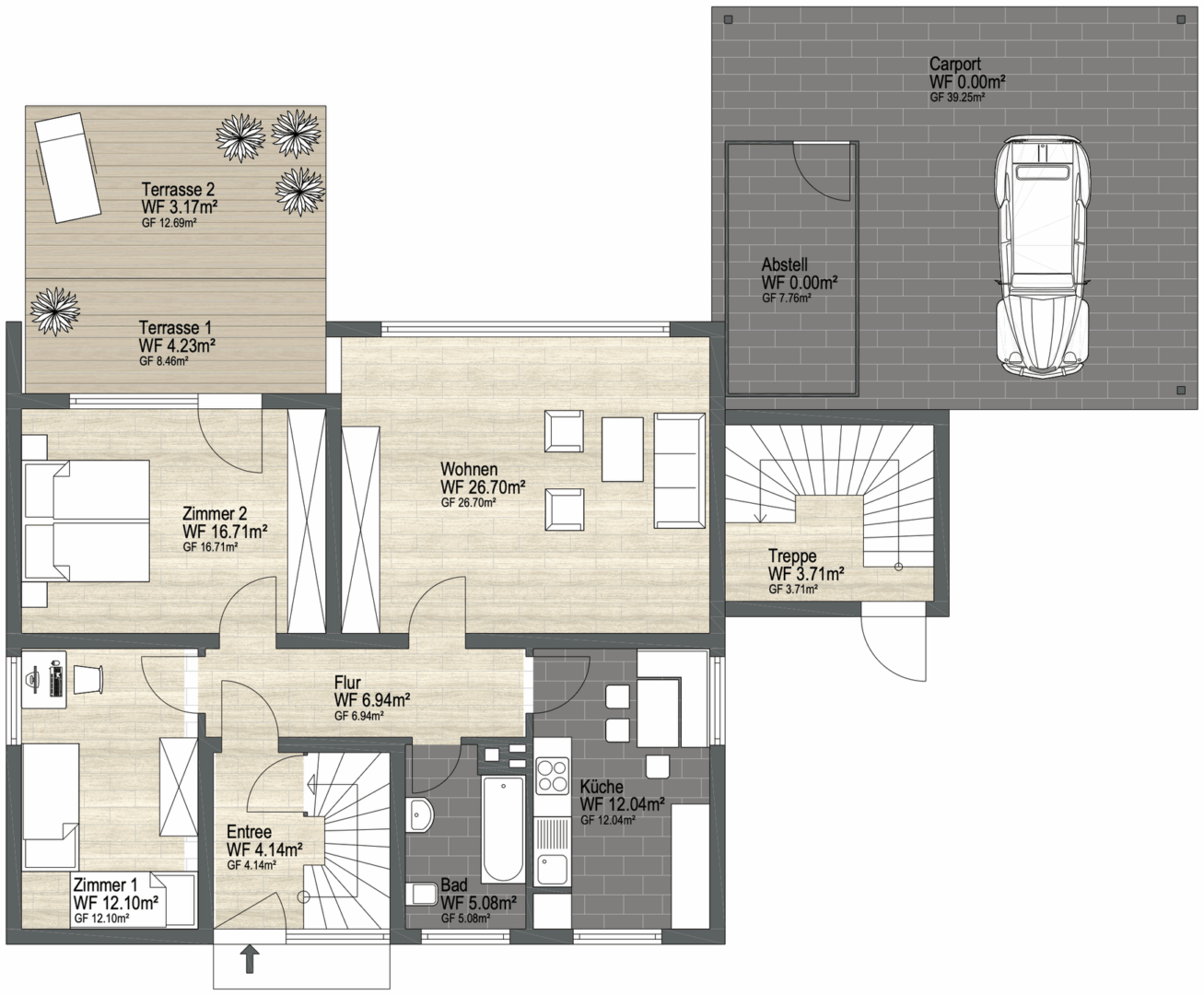 Ein Carport mit zwei Stellplätzen rundet das Angebot ab.