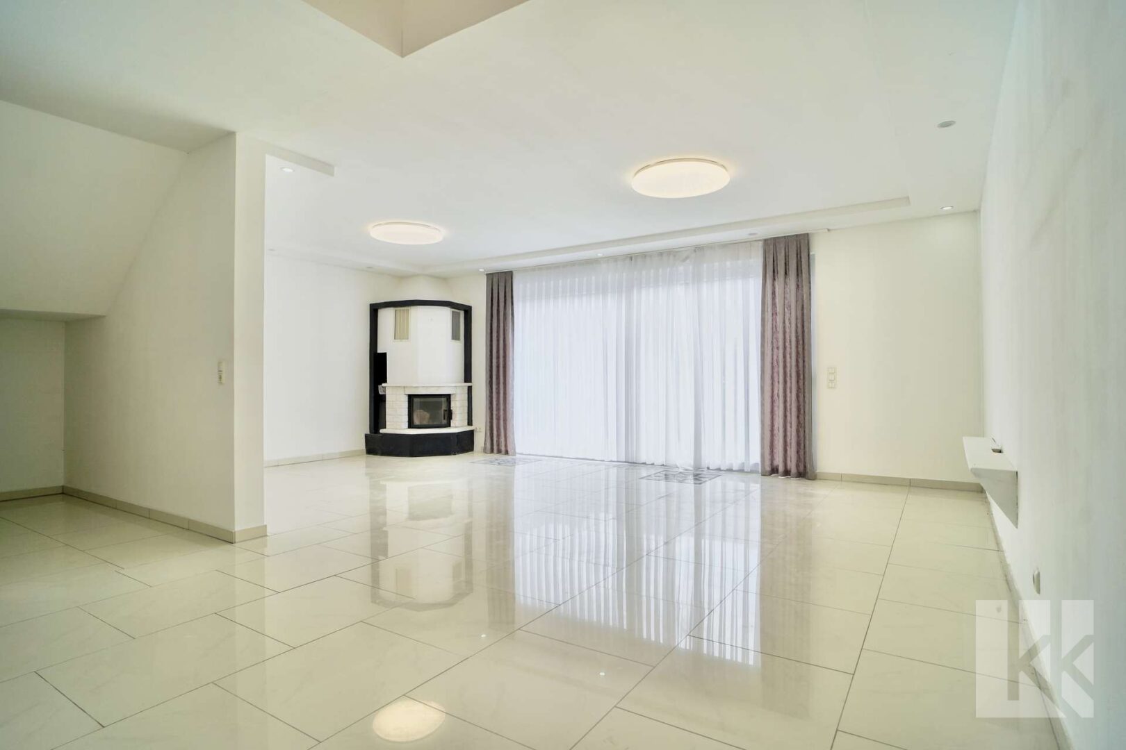 Wohnen und Essen gehen fließend ineinander über und bilden den Mittelpunkt des familiären Zusammenlebens. Ein großer Kamin sorgt für eine behagliche Atmosphäre und lädt zu gemütlichen Stunden ein. Von hier aus gelangt man auf die Terrasse und in den kleinen, geschützten Garten, der Raum für Entspannung und Erholung im Freien bietet.