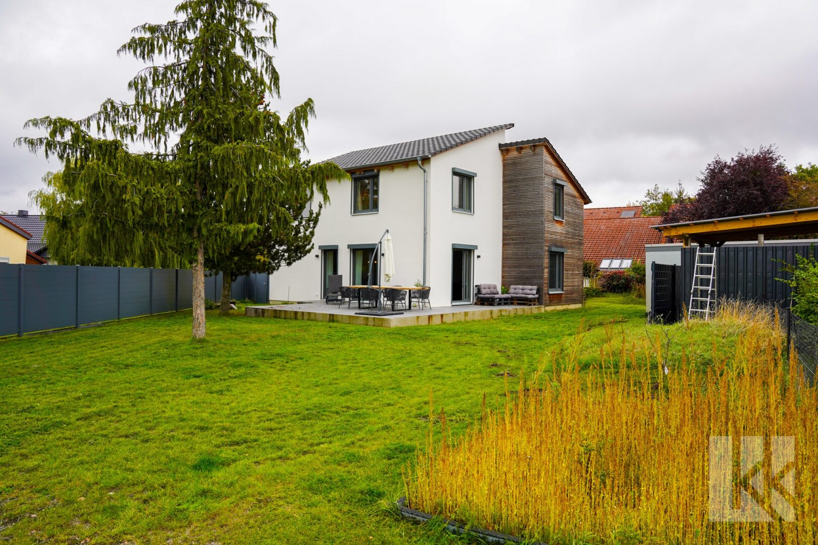 Der großzügige Garten ist aktuell noch ungestaltet und bietet somit freie Hand für Ihre individuellen Ideen – ob moderne Terrassenlandschaft, naturnaher Rückzugsort oder Spielbereich für Kinder: Hier entsteht Ihr persönliches Stück Lebensqualität.