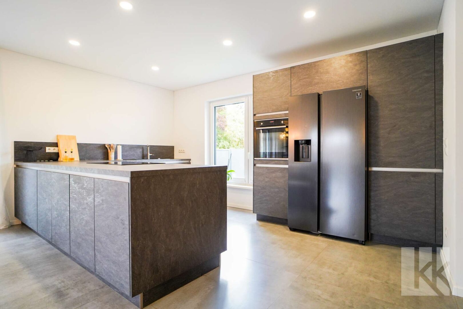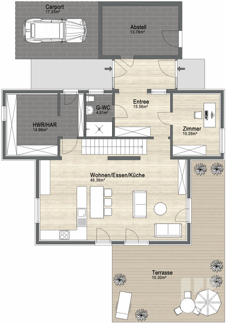 Der offen gestaltete Wohn- und Essbereich mit hochwertiger Einbauküche bildet das Herzstück des Hauses. Von hier gelangen Sie direkt auf die Terrasse und in den Garten – perfekt für gemeinsame Stunden im Freien. Der angrenzende Hauswirtschaftsraum bietet Stauraum und Zugang zu allen technischen Anschlüssen; über eine separate Tür erreichen Sie den Carport – ideal für kurze Wege beim Ankommen oder Einkaufen.