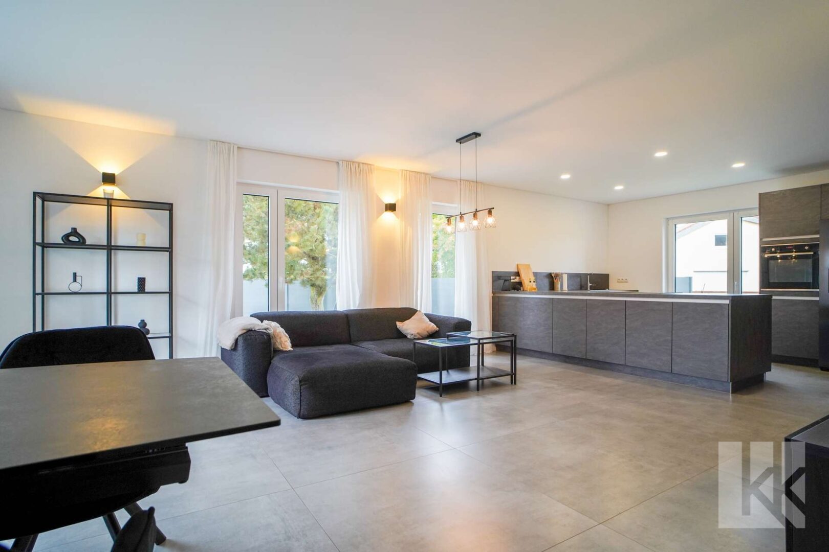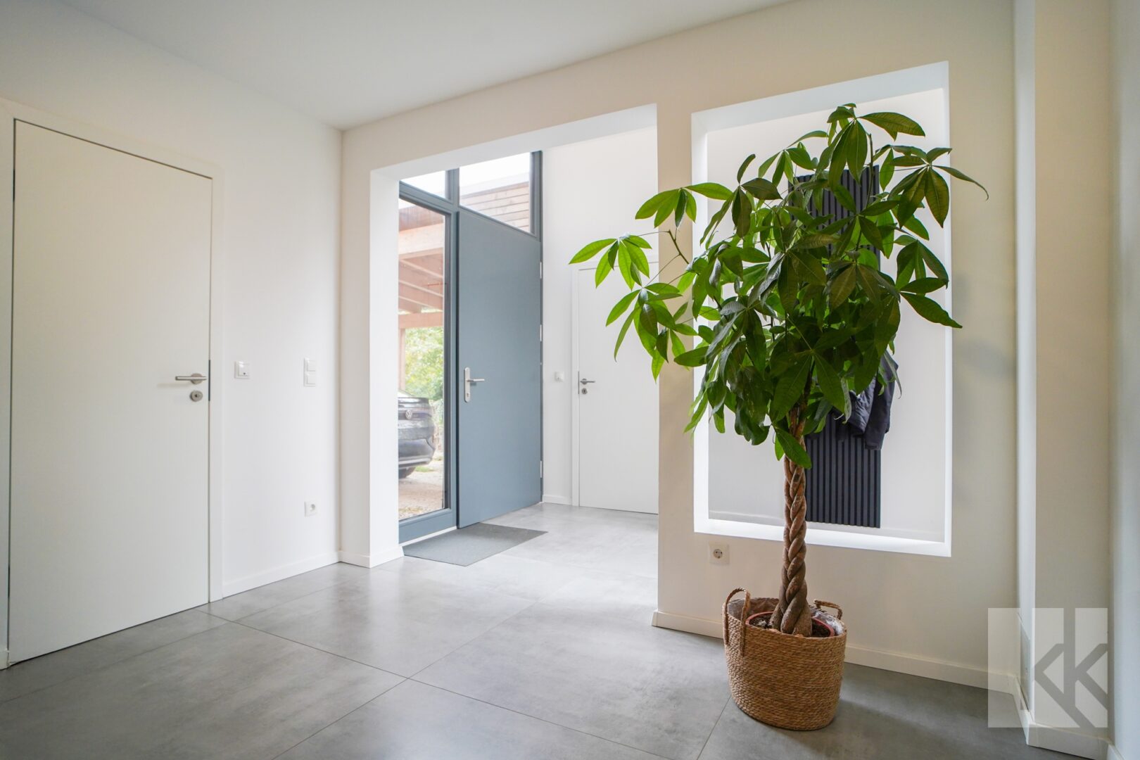 Bereits im Eingangsbereich empfängt Sie ein beeindruckendes Raumgefühl: hohe Decken, große Fensterflächen und ein offenes Gestaltungskonzept vermitteln Großzügigkeit und Licht. Zur linken Seite befindet sich ein vielseitig nutzbarer Raum, der als praktischer Durchgang mit direktem Gartenzugang oder als Abstellfläche genutzt werden kann. Rechts liegt ein modernes Gäste-WC mit Tageslicht und Dusche sowie ein weiteres Zimmer, das sich ideal als Homeoffice oder Gästezimmer anbietet.