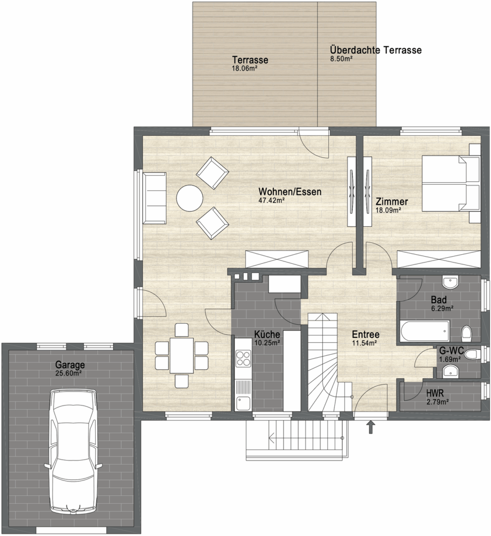 • Vollkeller mit beheiztem Hobbyraum und großen Fenstern