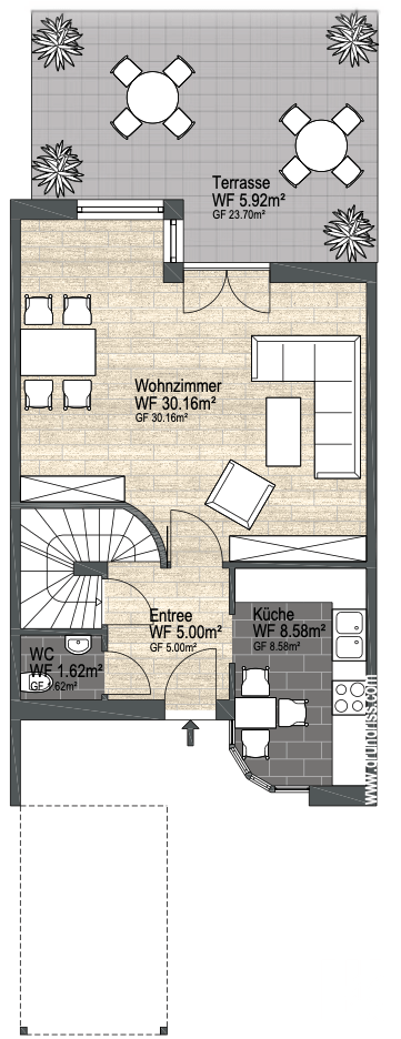 Im Eingangsbereich erreichen Sie direkt die gemütliche Küche sowie das Gäste-WC. Dahinter befindet sich der Wohn- und Essbereich als zentraler Raum des Hauses – mit direktem Zugang zur Terrasse und in den Garten. Der Außenbereich ist pflegeleicht angelegt und bietet genau den Rahmen, den man sich im Alltag wünscht: ausreichend Platz, ohne aufwendig zu werden.
