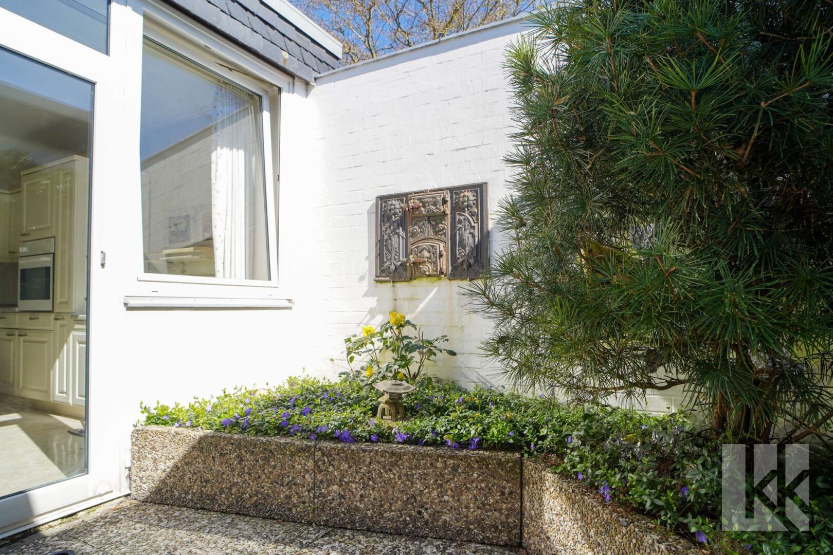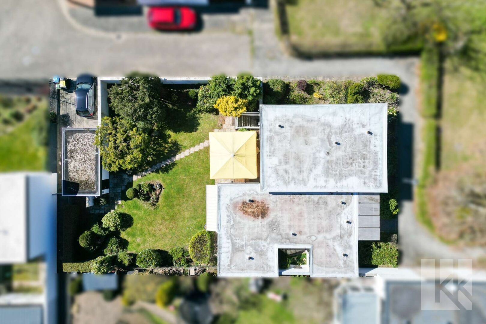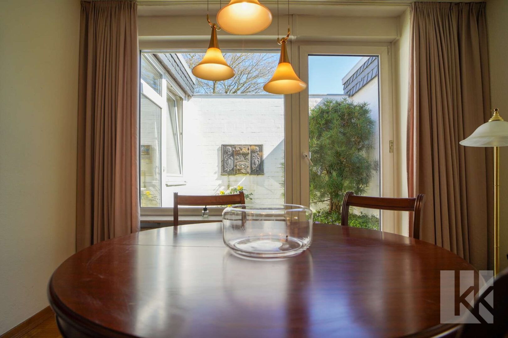 Vom Eingangsbereich mit Gäste-WC gelangen Sie in die abgeschlossene Küche, die den Blick in das Atrium freigibt. Dieses bildet das lichtbringende Zentrum des Hauses und prägt die besondere Architektur. Gegenüber liegt der Essbereich, der als verbindendes Element zwischen Küche, Atrium und Wohnbereich fungiert. Von hier aus erreichen Sie das großzügige Wohnzimmer mit Zugang zur sonnigen Terrasse. Der Garten ist gepflegt angelegt, angenehm überschaubar und bietet eine hohe Privatsphäre.