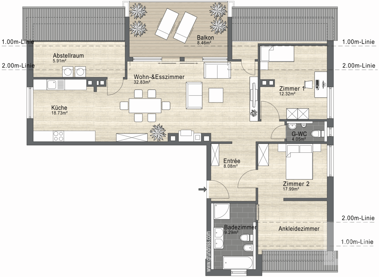 Betritt man die Wohnung, bietet sich zunächst Platz für eine Garderobe, daneben liegt das moderne Badezimmer mit Badewanne und Dusche. Das große Schlafzimmer mit angrenzendem Ankleidezimmer misst rund 18 m² und bietet damit viel Raum für Komfort. Ein weiteres Zimmer eignet sich ideal als Kinder-, Gäste- oder Arbeitszimmer. Hinzu kommt ein praktisches Gäste-WC.