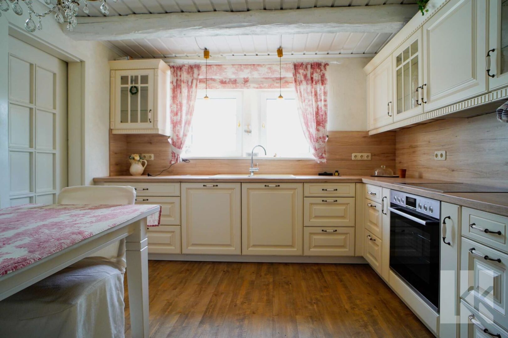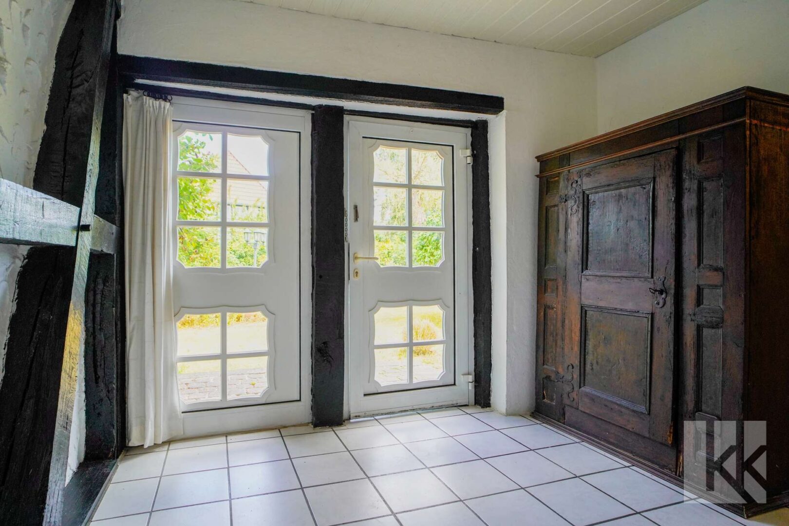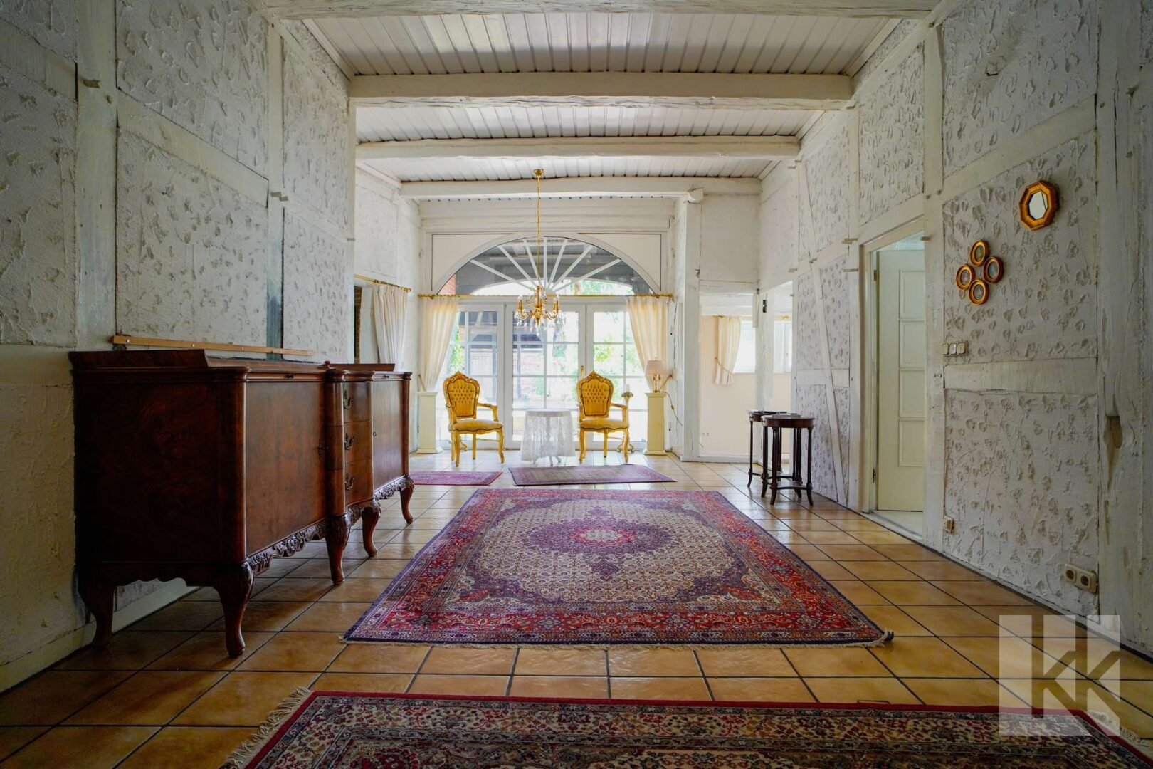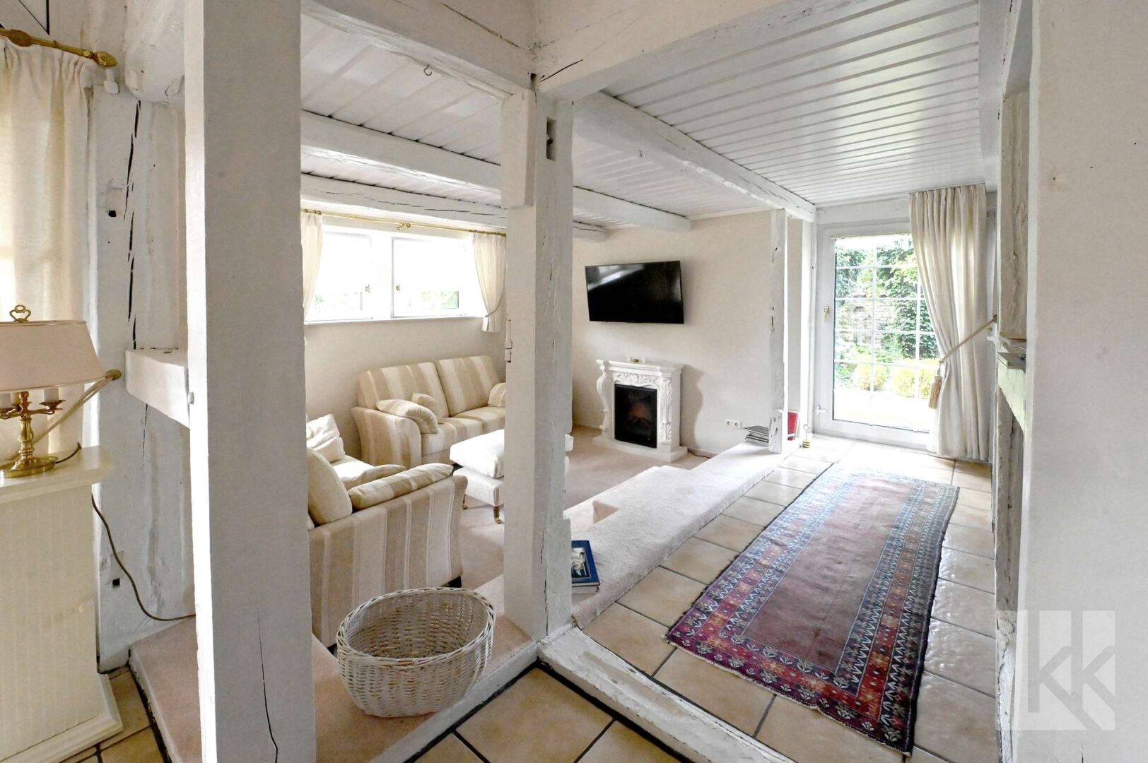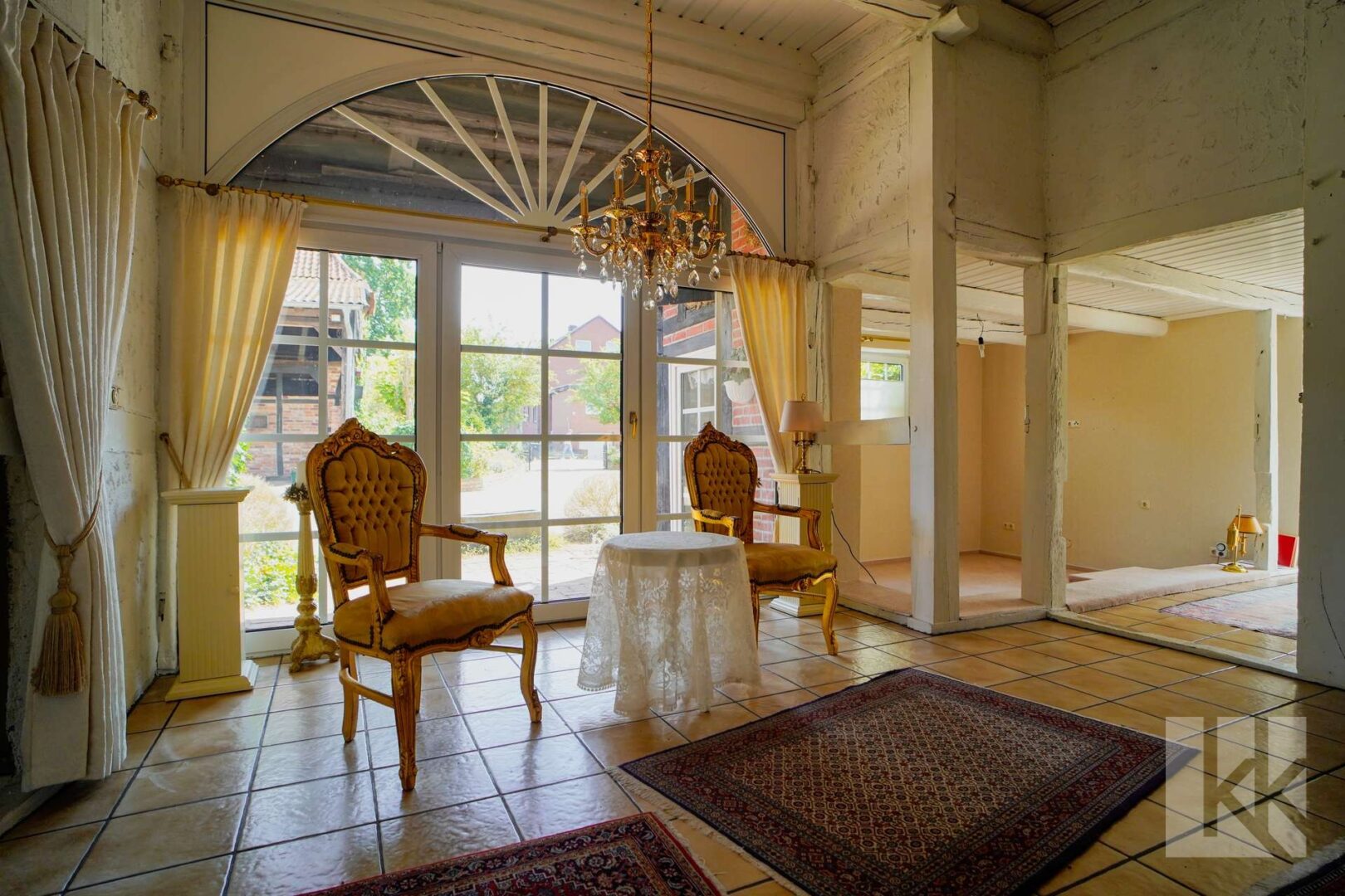 Die nostalgisch angehauchte Sitzecke verfügt über einen direkten Zugang auf die Terrasse die Sie direkt in den märchenhaften – von der anderen Wohneinheit abgegrenzten – Garten führt.