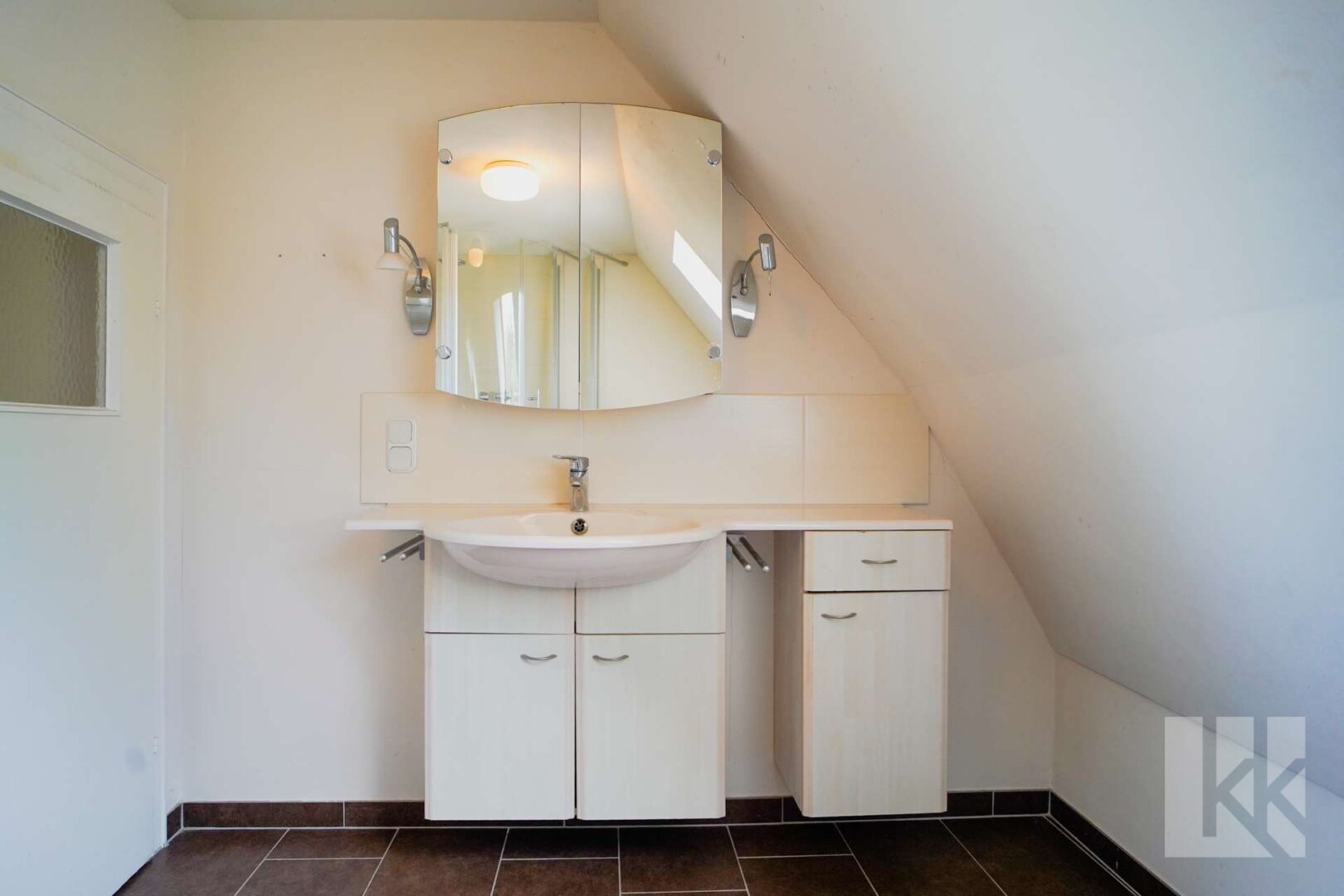 Das zusätzliche Badezimmer mit Doppelwaschtisch und ebenerdiger Dusche wurde im Jahr 2020 modern saniert.