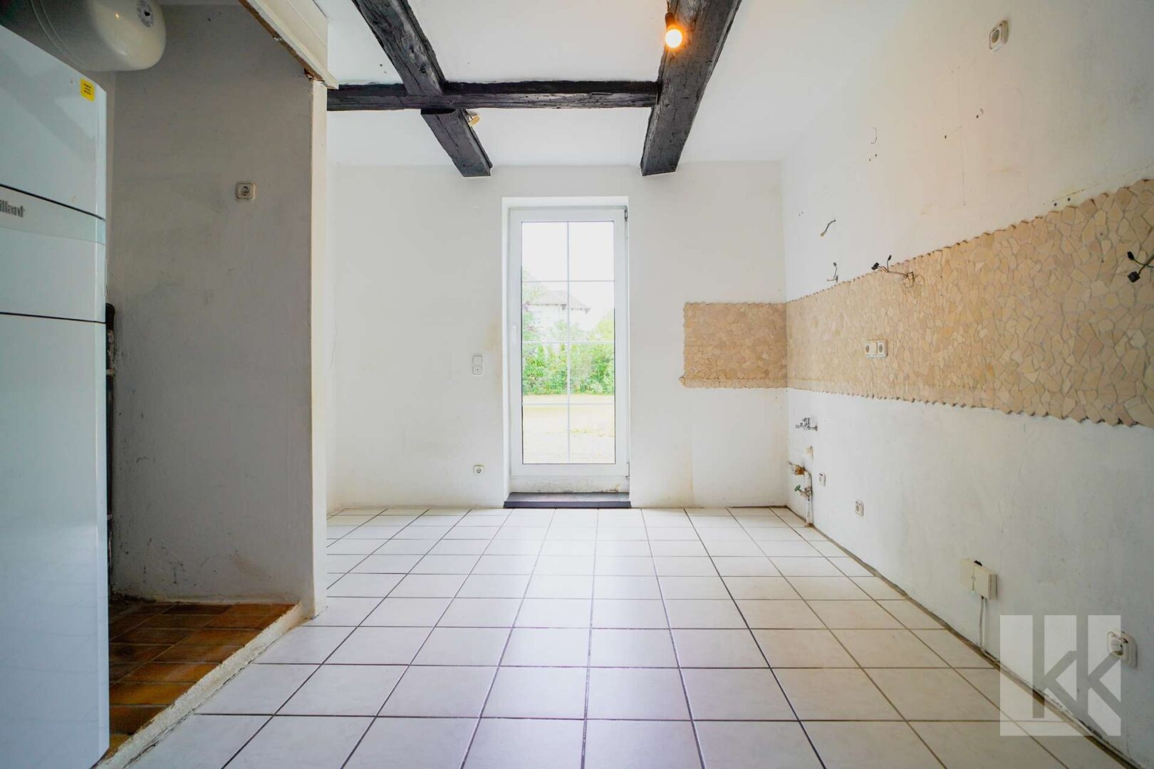 Es erwartet Sie zunächst der Flur mit separater Garderobe und einem großen Badezimmer mit Badewanne. Dann finden Sie sich in der Diele mit dem schönen alten Kamin wieder und schauen in Ihre Küche mit Zugang zur Terrasse. Über eine angrenzende Speisekammer gelangte man früher in die andere Wohneinheit. Heute ist dieser Übergang geschlossen.