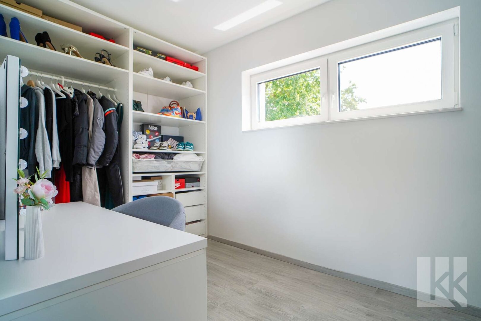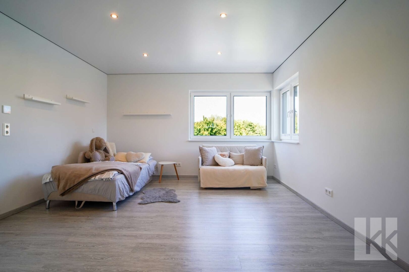 Schon beim Betreten des Hauses beeindruckt die Großzügigkeit des Eingangsbereichs und eröffnet den Blick auf die stilvoll gestalteten Wohnräume. Im Erdgeschoss erwartet Sie ein privater Elternbereich mit einem großzügigen Schlafzimmer, einer exklusiven Ankleide sowie einem luxuriösen Bad mit Natursteinteppich und freistehender Wanne – ein Rückzugsort, der wie ein privates Spa wirkt.