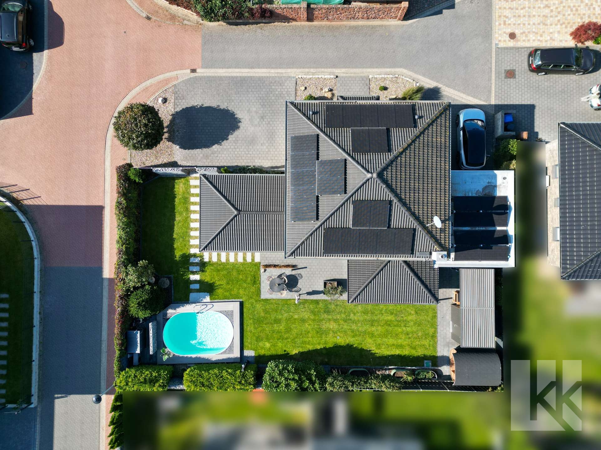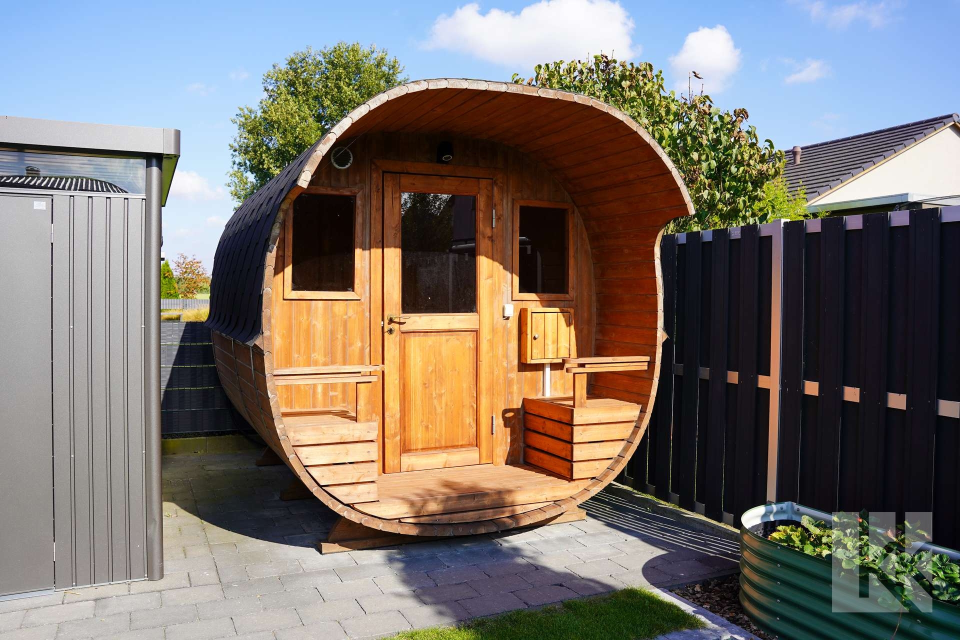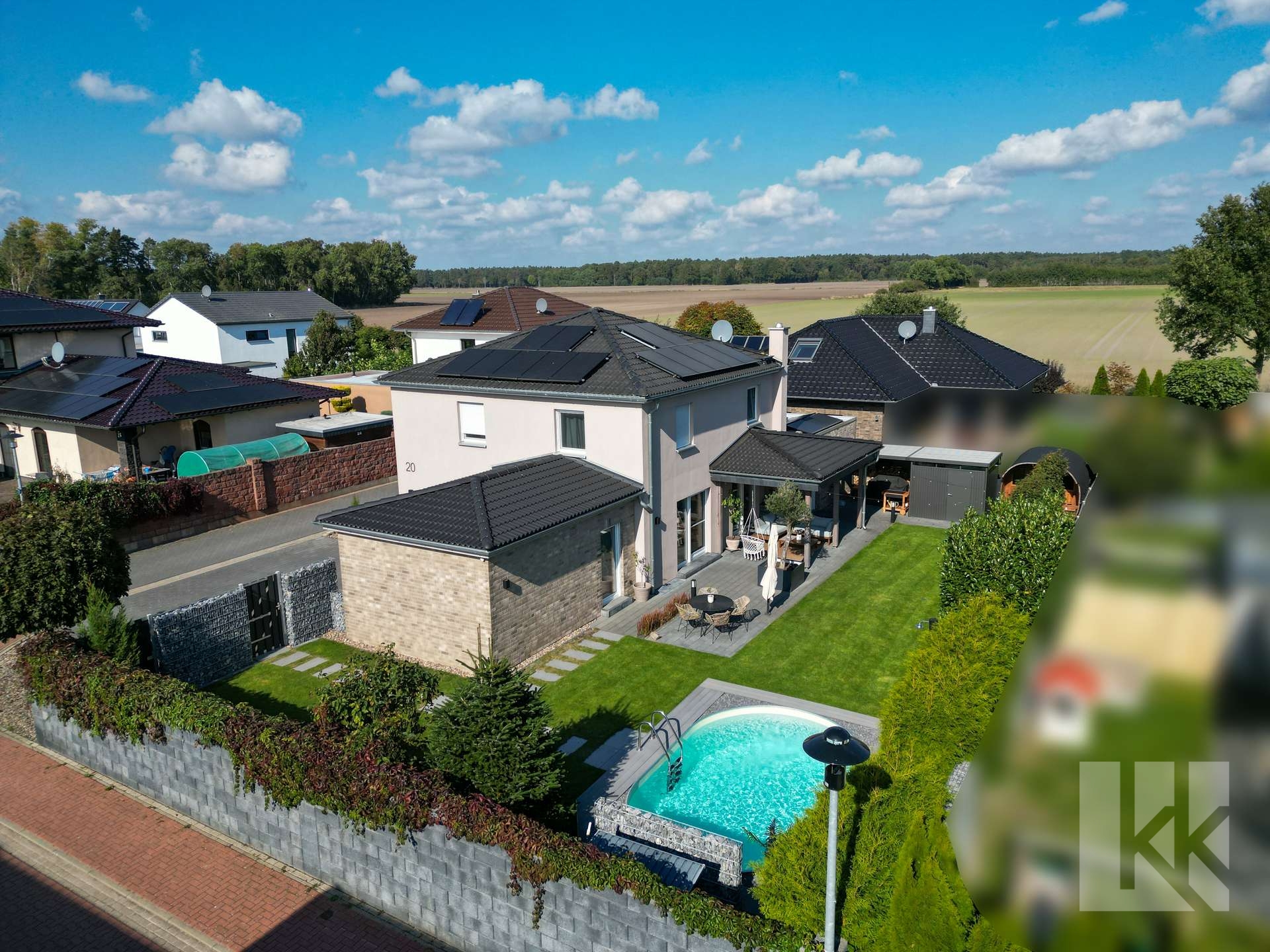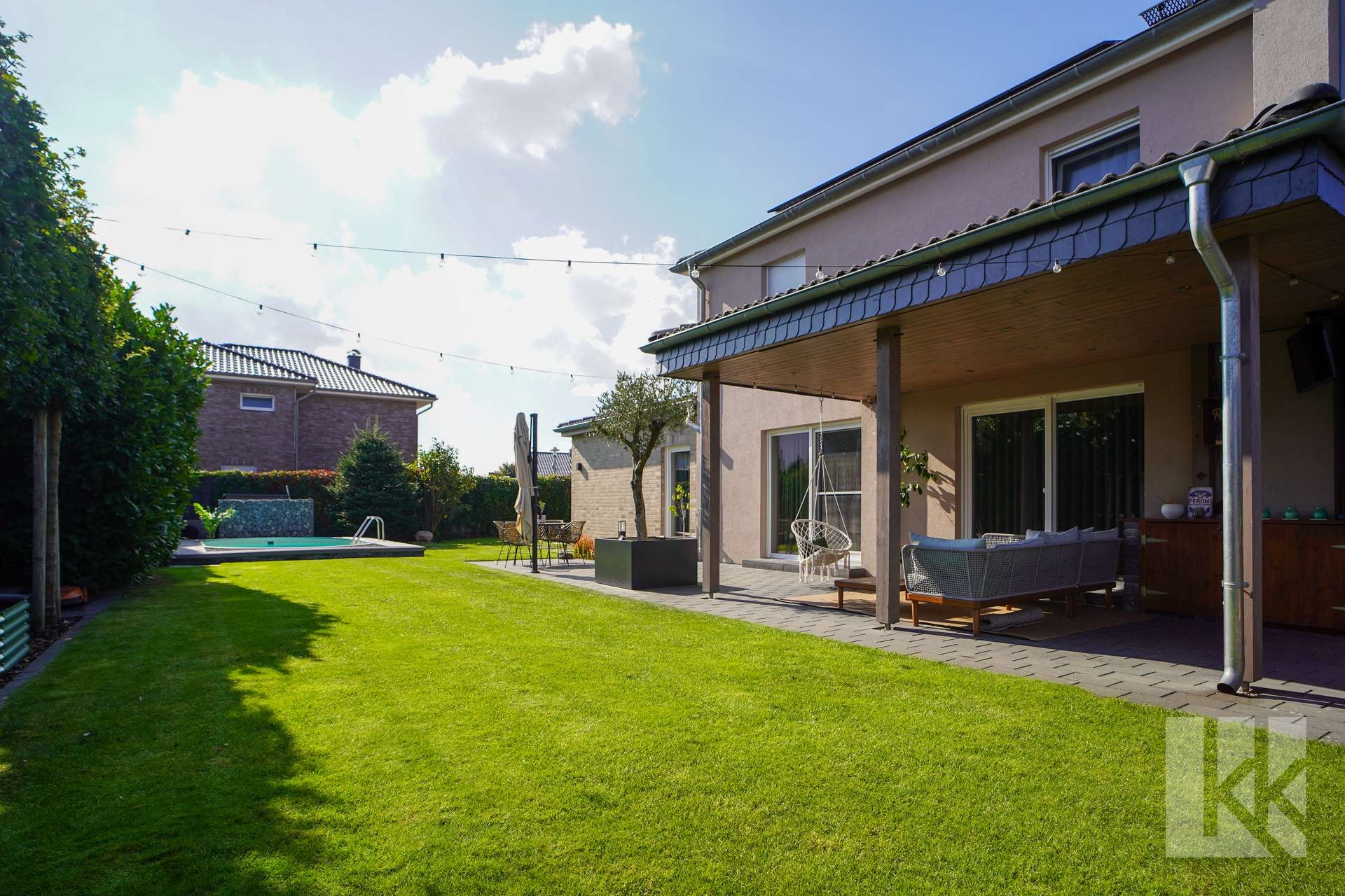 Der liebevoll gestaltete Garten mit Terrasse, Fasssauna und beheizbarem Pool schafft eine private Wohlfühloase, die zum Entspannen und Genießen einlädt.