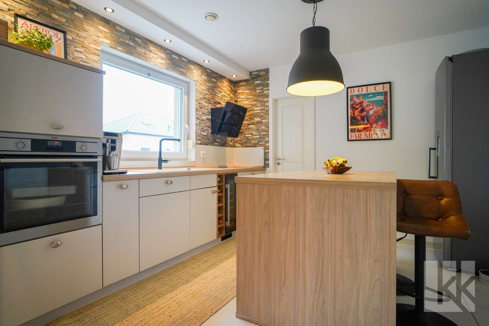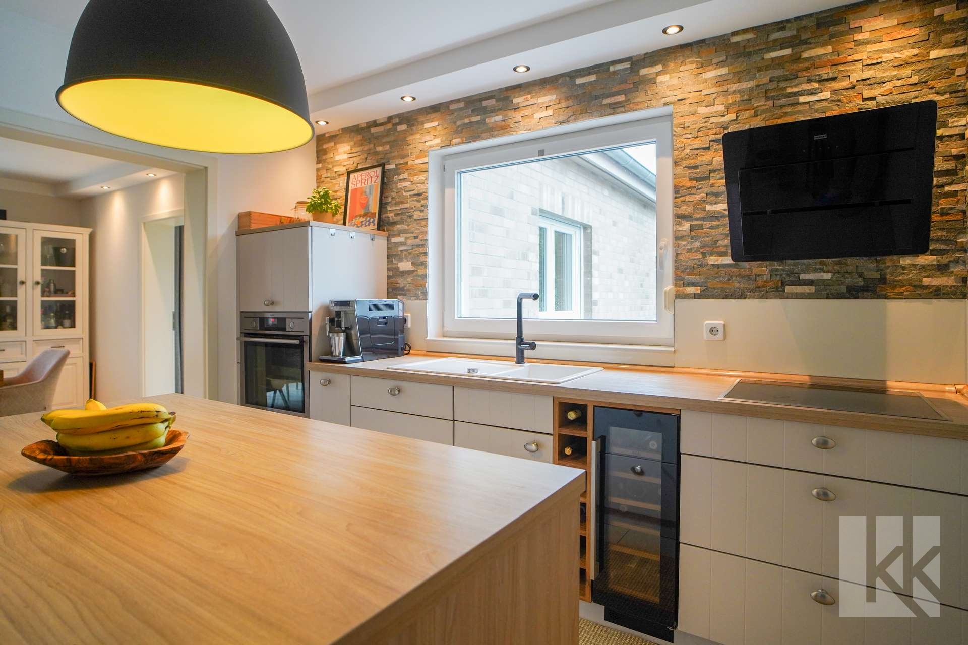 Die angrenzende Küche überzeugt durch eine durchdachte Planung und bietet zusätzlich einen separaten Vorratsraum – ideal für alle, die Freude am Kochen haben. Auf Wunsch lässt sich der Wohn- und Essbereich durch eine Wand oder eine Flügeltür von der Küche abtrennen.