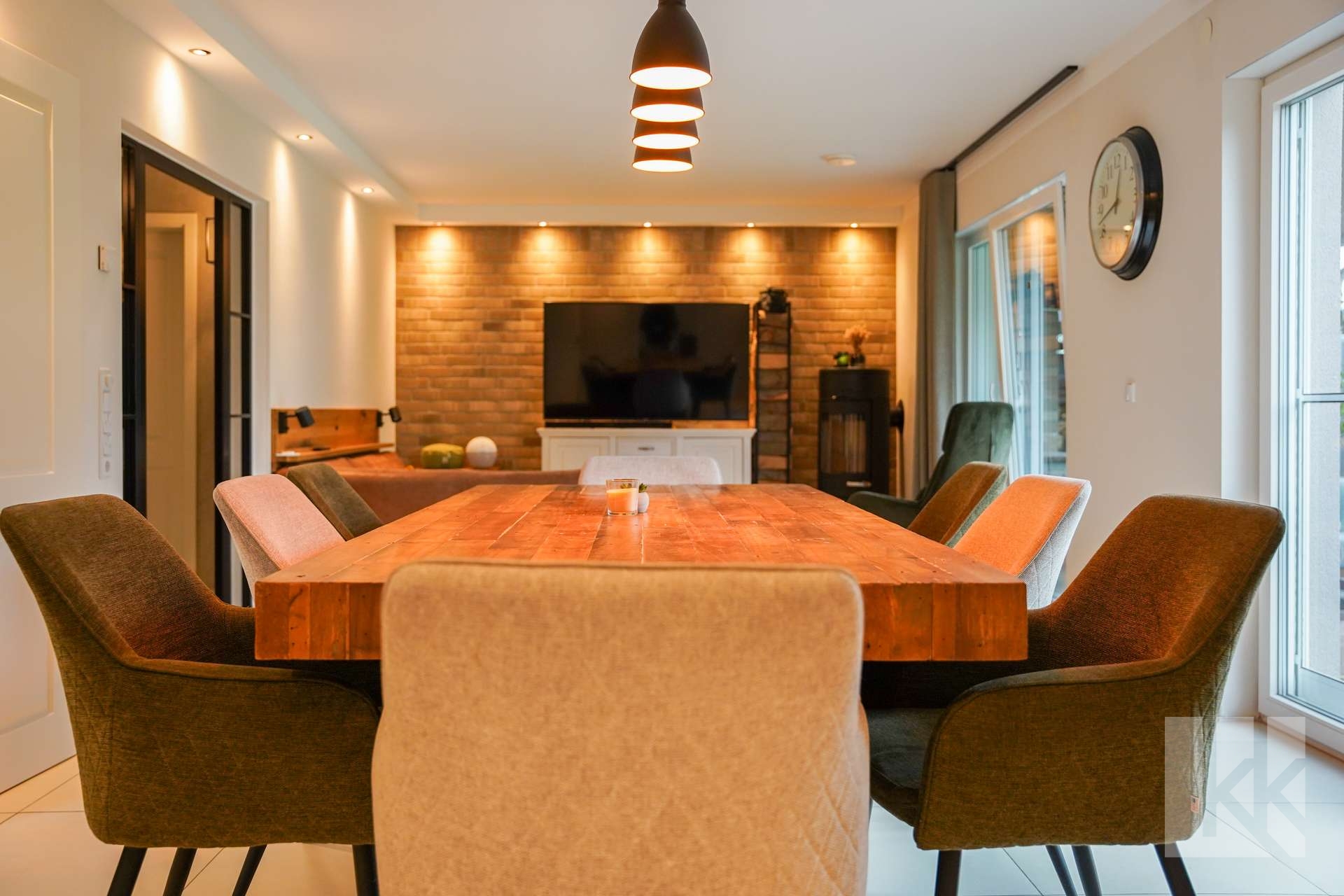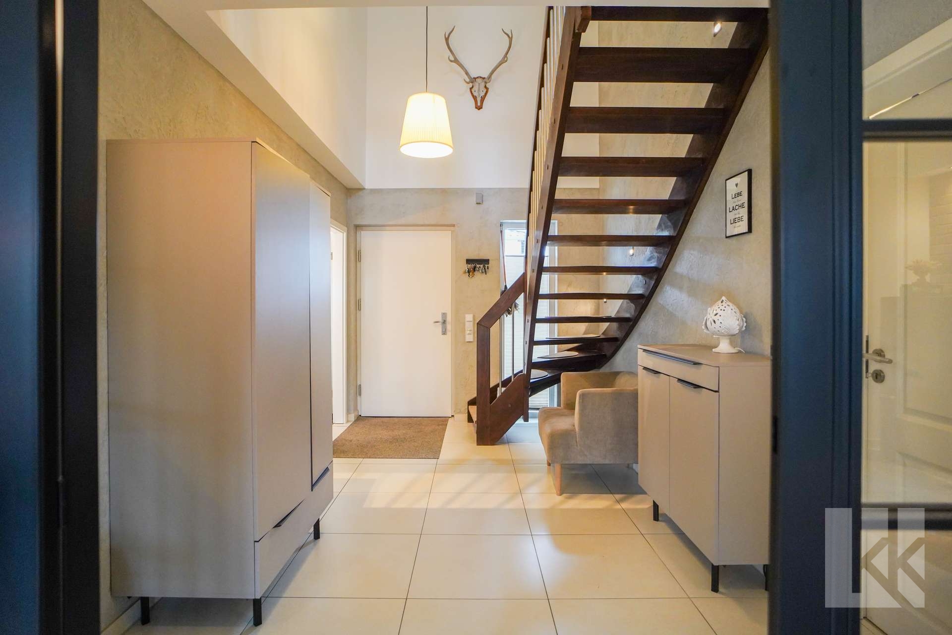 Der einladende Eingangsbereich überzeugt mit Helligkeit und offenem Raumgefühl. Eine stilvolle Glastür gewährt bereits beim Betreten den ersten Blick in den lichtdurchfluteten Wohn- und Essbereich, wo große Fenster für Tageslicht und ein Kamin für wohlige Wärme sorgen.