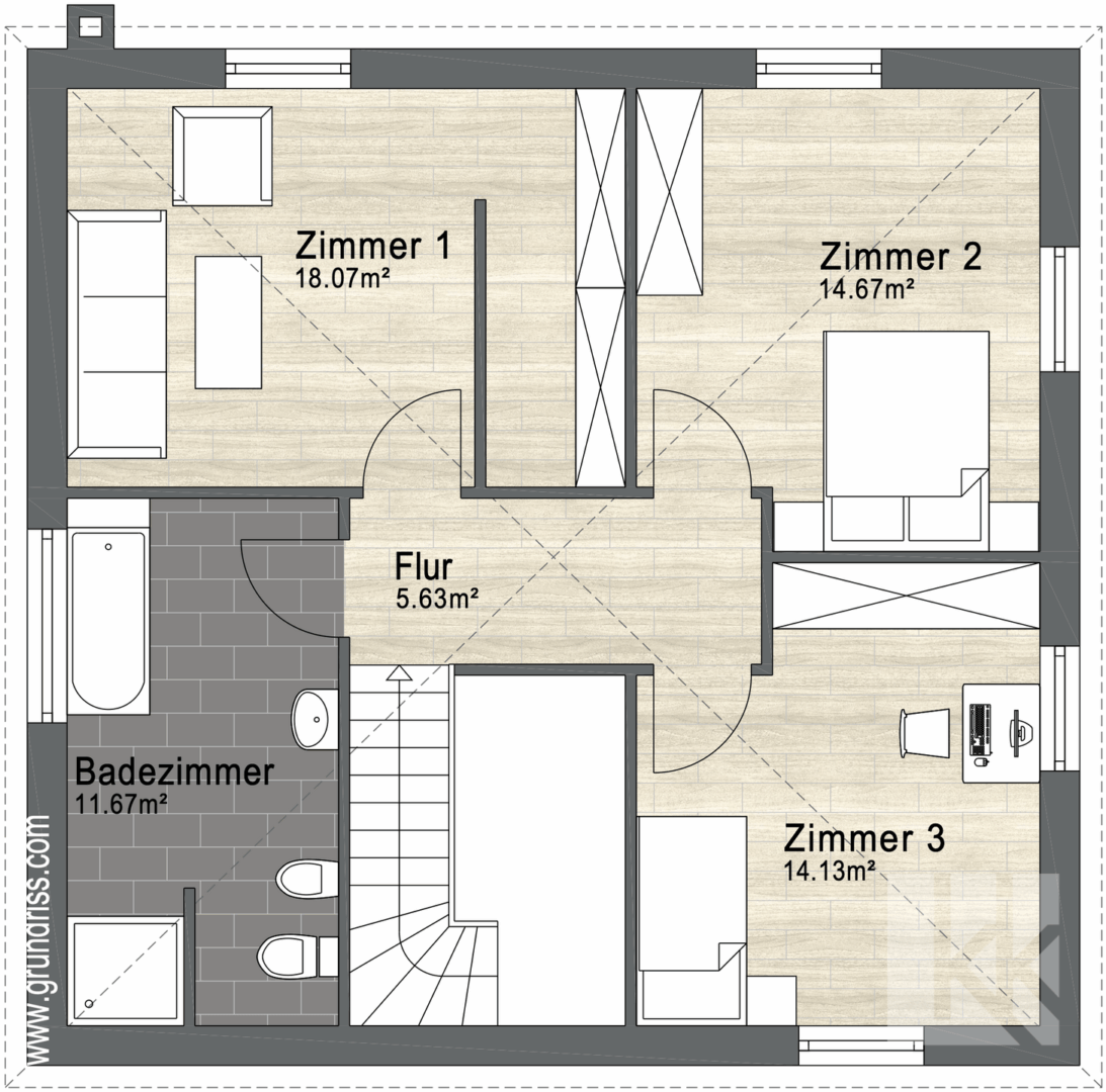 Im Obergeschoss erwarten Sie drei helle Schlafzimmer sowie ein großzügiges Tageslichtbad mit Badewanne, Dusche, Bidet und WC – ein privater Rückzugsort für kleine Wellnessmomente. Der Spitzboden bietet zusätzlichen Stauraum.