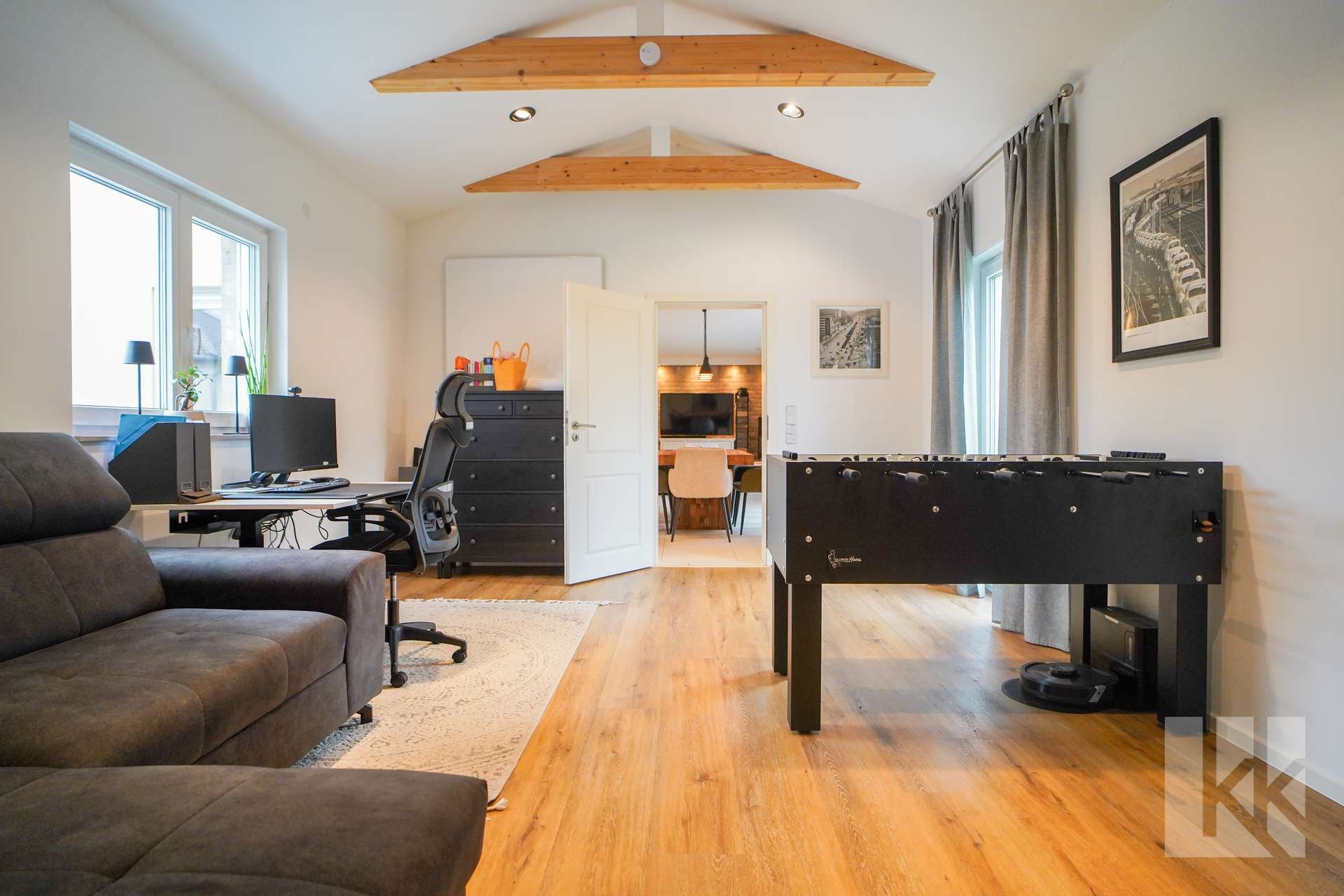 Vom Wohnbereich aus führt der Weg in einen Anbau, der flexibel als Homeoffice, Gästezimmer oder kreativer Rückzugsort genutzt werden kann. Von dort gelangen Sie direkt in den Garten und auf die teils überdachte Terrasse – der perfekte Ort für entspannte Stunden mit Familie und Freunden.