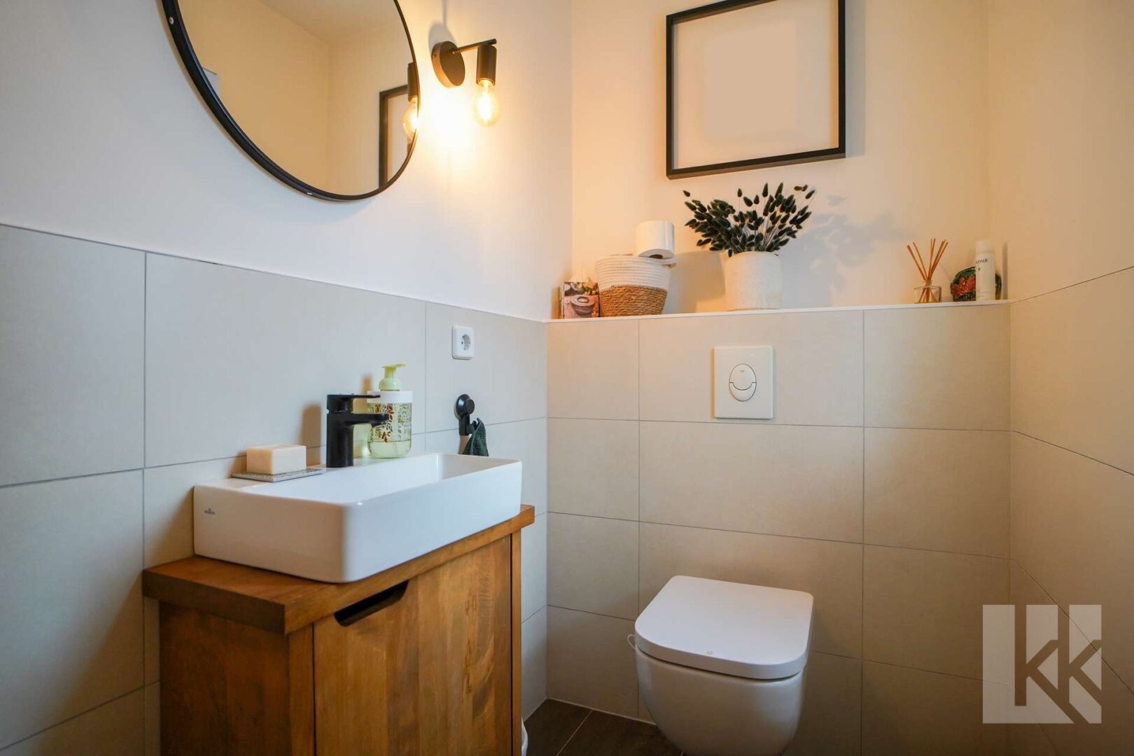 Ein Gäste-WC mit Tageslicht sowie ein Hauswirtschaftsraum mit direktem Zugang zur Garage ergänzen das Erdgeschoss auf praktische Weise.