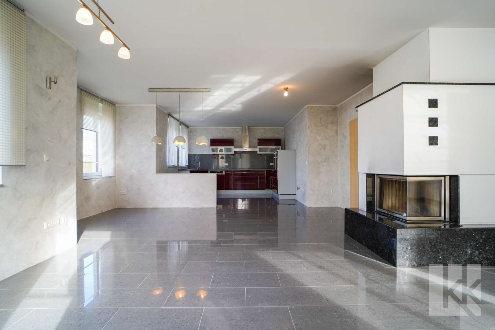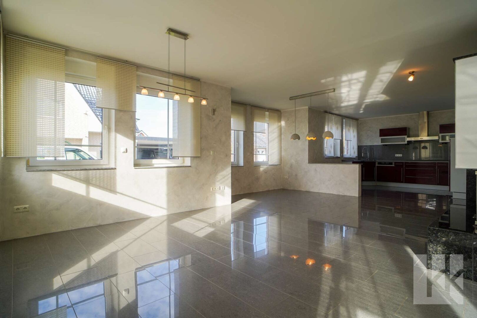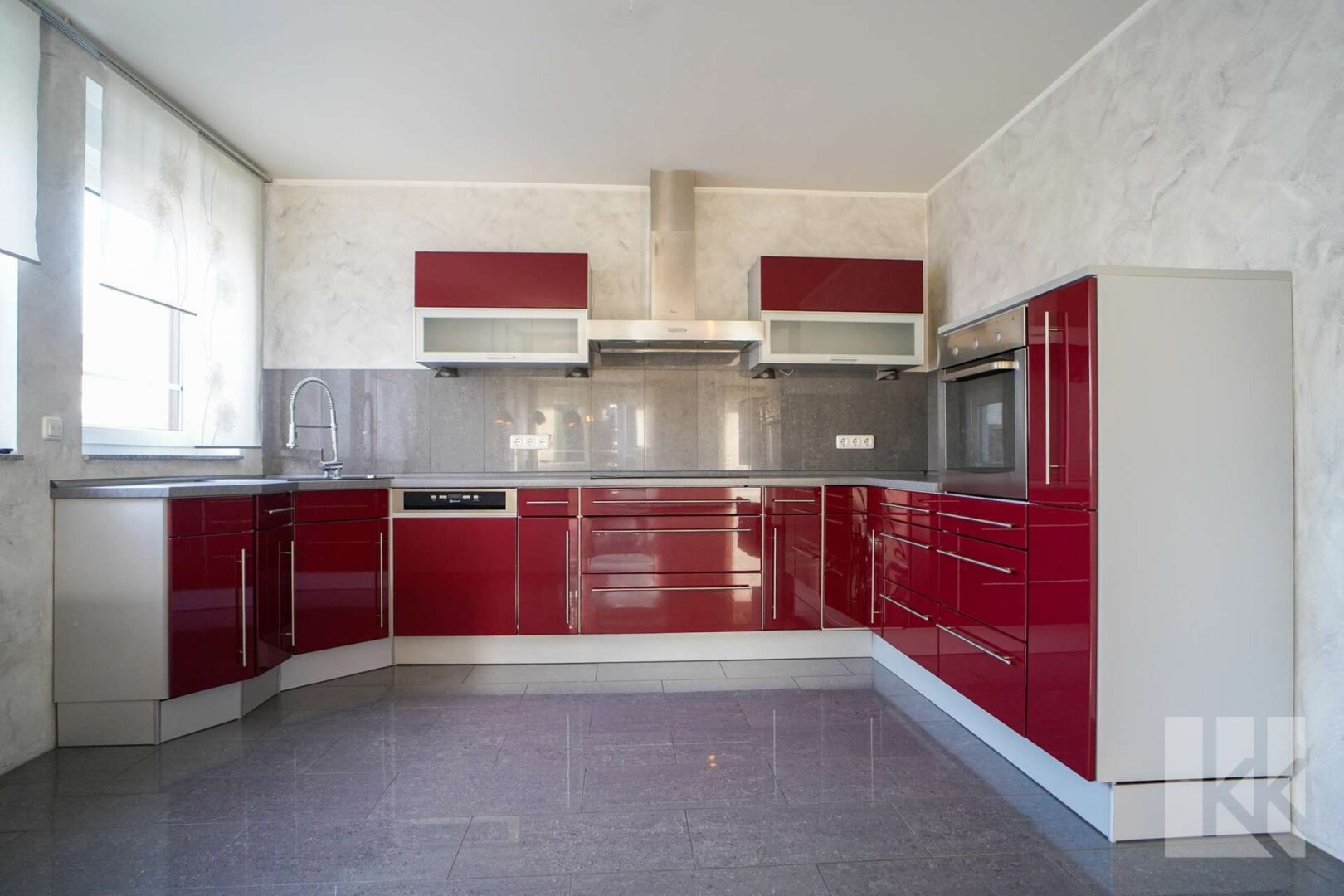 Die großzügige Einbauküche präsentiert sich modern und selbstbewusst. Mit ihren Hochglanzfronten, viel Arbeitsfläche und klarer Linienführung ist sie kein Nebenraum, sondern bewusstes Gestaltungselement des Wohnbereichs. Kochen und Leben gehen hier fließend ineinander über.