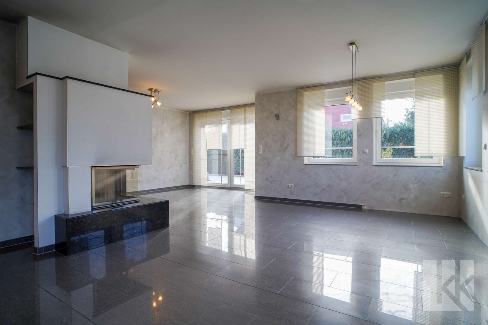 Der hintere Bereich des Hauses öffnet sich zu einem weitläufigen Wohn-, Ess- und Kochbereich. Große Fensterflächen bringen viel Tageslicht ins Innere und schaffen eine direkte Verbindung zur Terrasse und in den Garten. Der Kamin setzt zwischen Wohn- und Esszone einen architektonischen Akzent und verleiht dem offenen Raum Struktur sowie Atmosphäre.