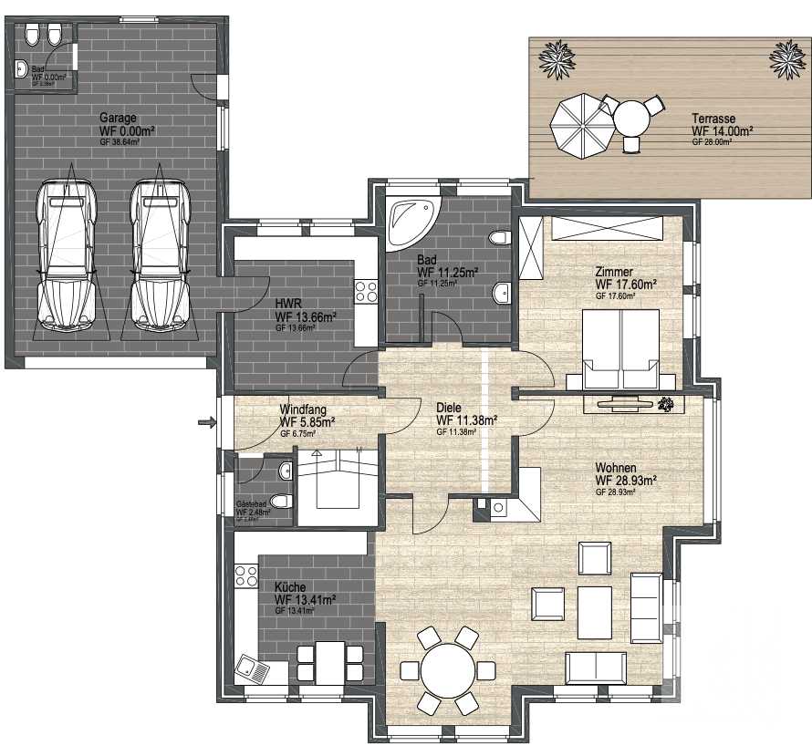 Hier befinden sich ein Schlafzimmer, ein Tageslichtbad mit Dusche und Badewanne sowie ein Hauswirtschaftsraum mit direktem Zugang zur Doppelgarage – funktional gelöst und im Alltag spürbar komfortabel.