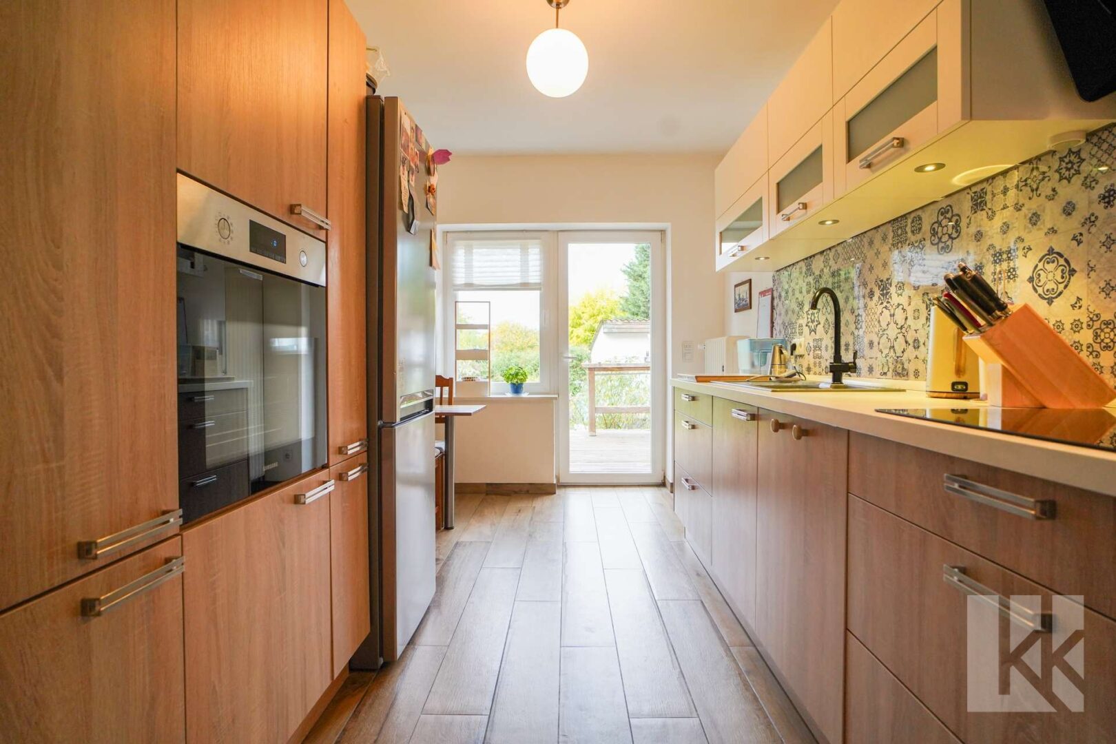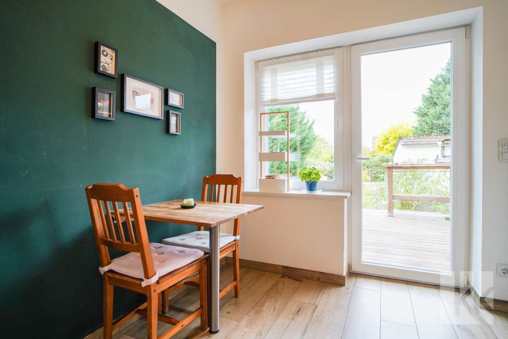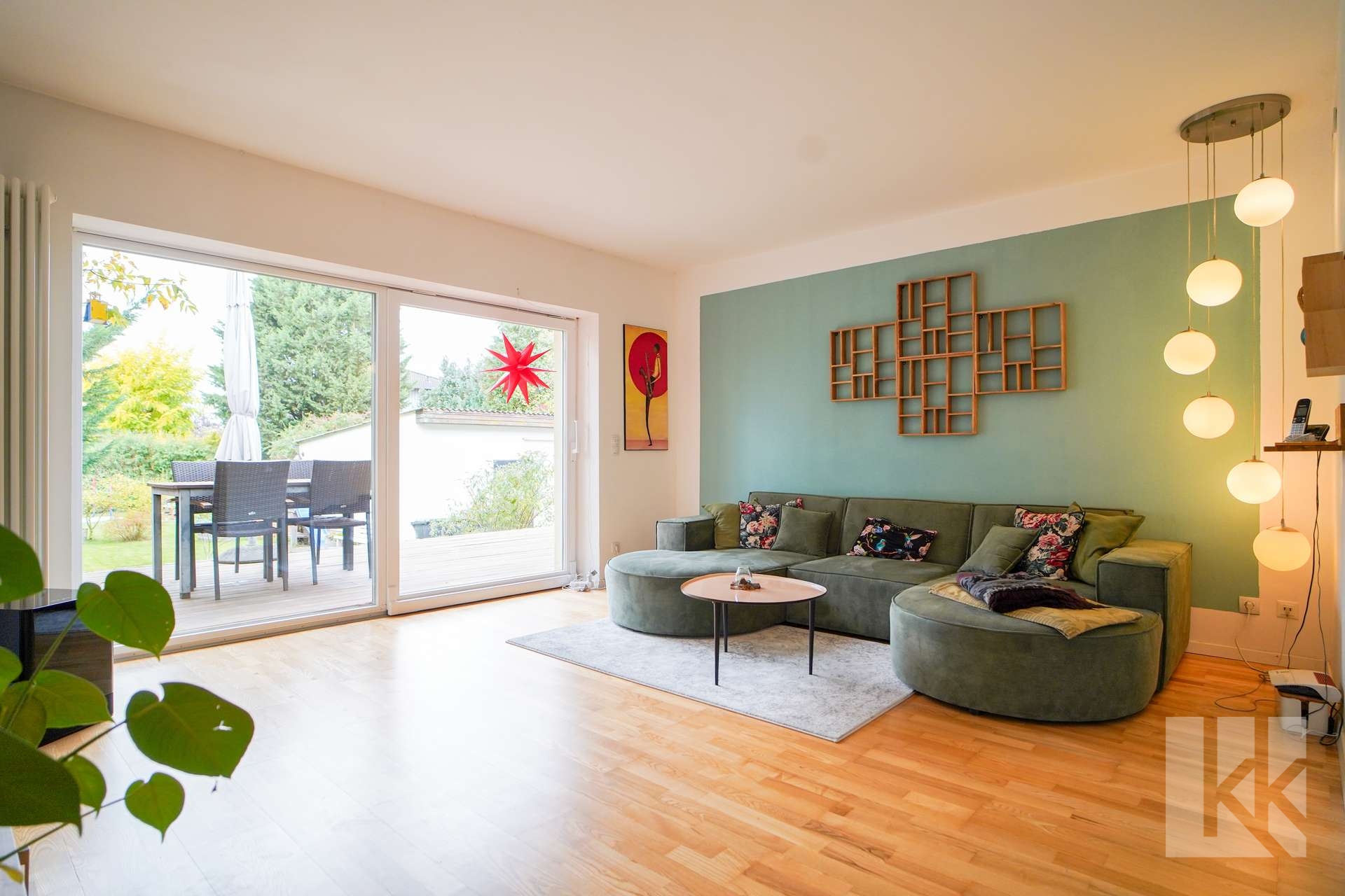 Links befindet sich der großzügige Wohn- und Essbereich mit direktem Zugang zur Terrasse und in den Garten. Die angrenzende Küche – ebenfalls mit Terrassenzugang – wird ergänzt durch zwei flexibel nutzbare Zimmer, ideal als Schlaf-, Gäste- oder Arbeitszimmer, sowie einen kleinen Abstellraum. Das Tageslichtbad mit Badewanne und Duschoption wurde 2015 modernisiert und präsentiert sich in sehr gepflegtem Zustand.