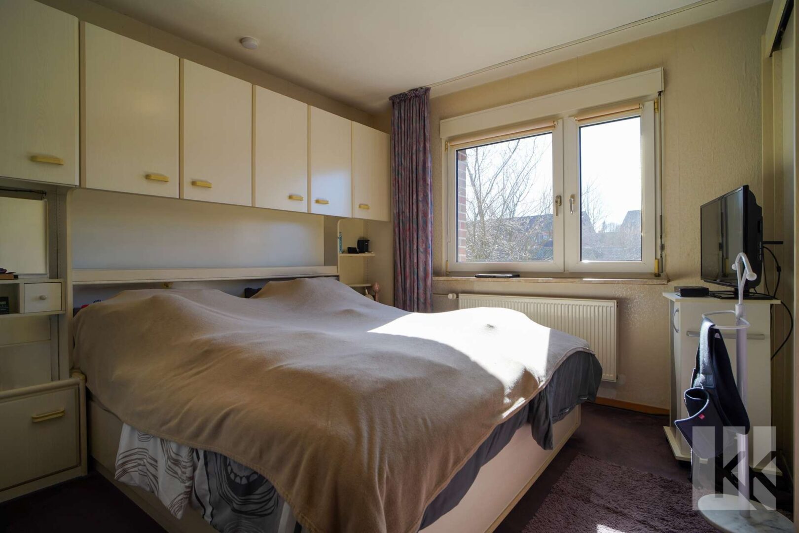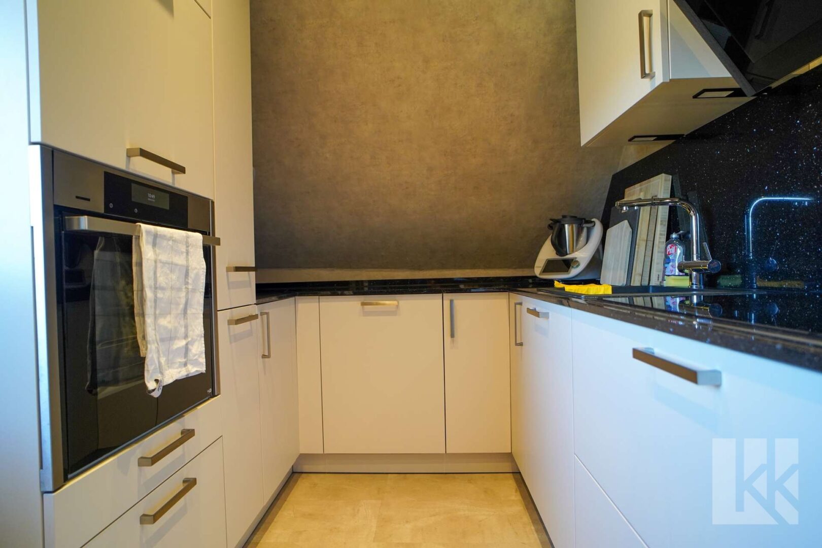 Hier befinden sich die Küche, die mit einer Einbauküche ausgestattet ist, das Badezimmer mit ebenerdiger Dusche, ein Schlafzimmer, ein kleines Büro und das helle Wohnzimmer. Von hieraus gelangt man zur Terrasse und in den pflegeleicht angelegten Garten.