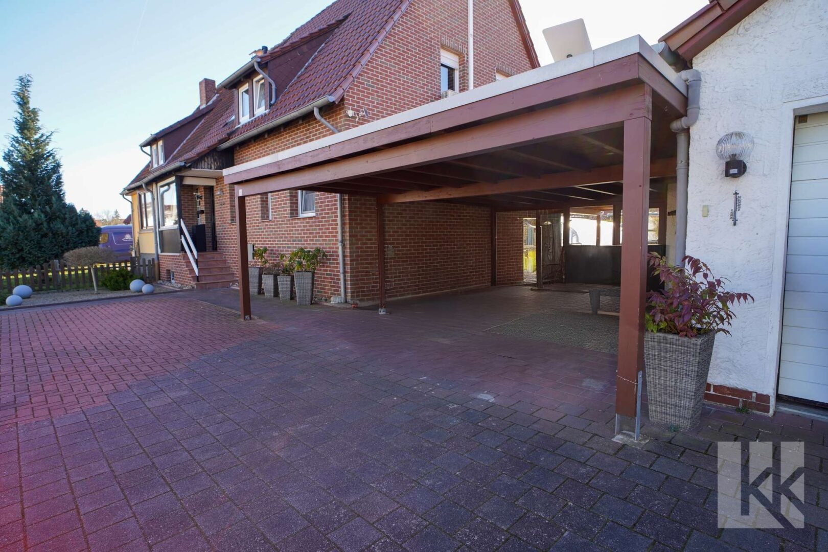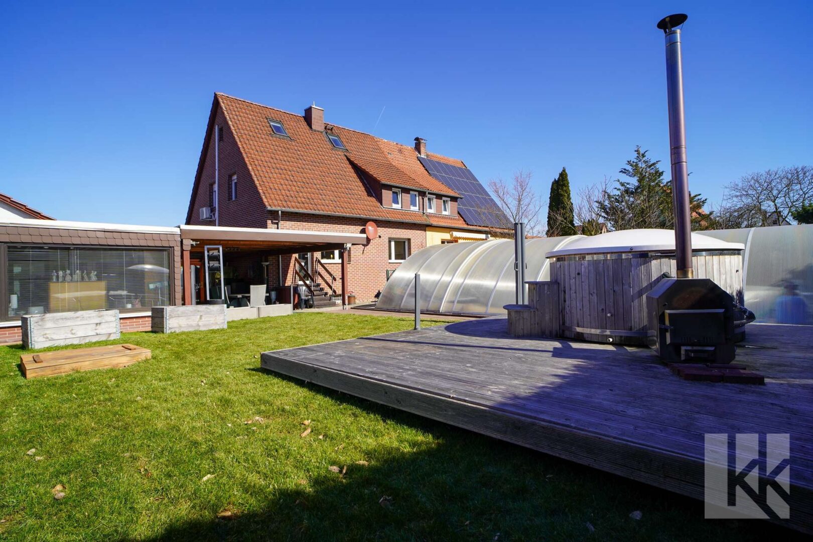 Zum Haus gehören ein Doppelcarport, eine Garage, ein Pool, ein separater Whirlpool sowie ein gemütliches Gästehaus. Aus dem Gästebereich haben Sie ebenso Zugang in den Garten.