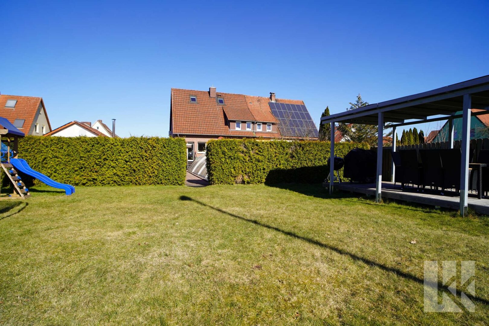 Ein pflegeleicht und liebevoll angelegter Garten lässt die Herzen aller höher schlagen. Dieser bieten Ihnen durch seine Uneinsehbarkeit und Weitsichtigkeit viel Privatsphäre und besticht durch die große Terrasse.