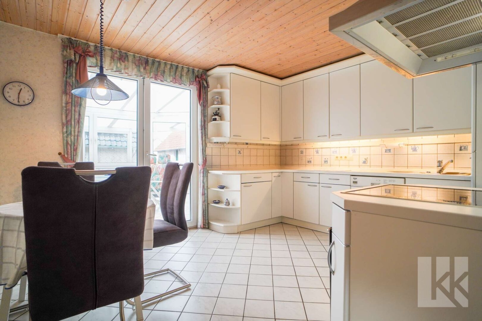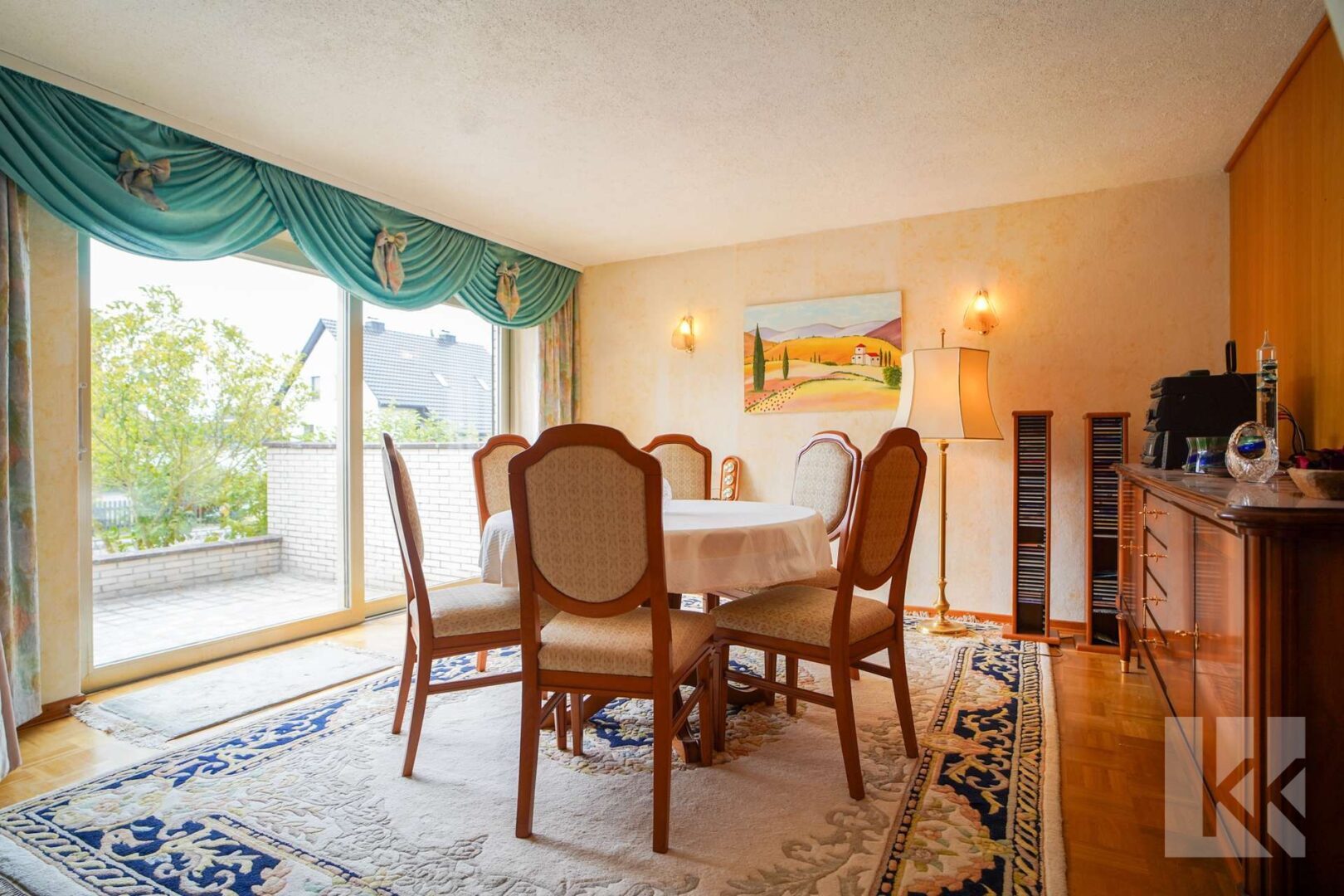 Im Erdgeschoss bildet das helle Wohn- und Esszimmer den Mittelpunkt, der Essbereich wurde in den 70er-Jahren angebaut und mit Parkett ausgestattet. Nebenan liegen ein Schlafzimmer oder Gästezimmer, die Küche mit angrenzendem Wintergarten von etwa 15 m² sowie ein Badezimmer mit Dusche und Wanne. Über den Anbau von 1992 erreicht man ein großes Schlafzimmer, das vielfältige Gestaltungsmöglichkeiten offenlässt, da in der Wand Wasseranschlüsse vorhanden sind. Zudem befindet sich hier ein weiteres Kinderzimmer.