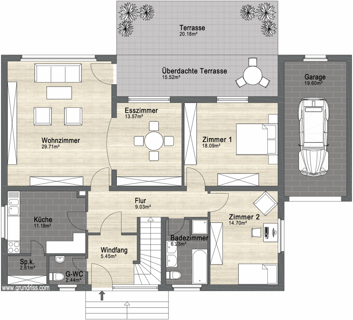 Im Erdgeschoss betreten Sie zunächst den Windfang mit Gäste-WC, bevor Sie in die Küche mit anliegender Speisekammer gelangen. Herzstück des Hauses ist der große Wohn- und Essbereich, in dem das 2021 erneuerte Parkett für eine angenehme Wohnatmosphäre sorgt. Von hier führt der Weg hinaus auf die überdachte Terrasse – ein herrlicher Platz für entspannte Stunden mit Blick ins Grüne.