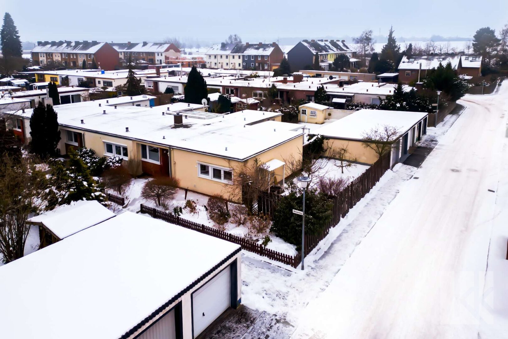 Wohnsiedlung von Wolfsburg-Vorsfelde. Die eingeschossige Bauweise, die klare Raumaufteilung und das große Eigentumsgrundstück schaffen beste Voraussetzungen für komfortables Wohnen auf einer Ebene.