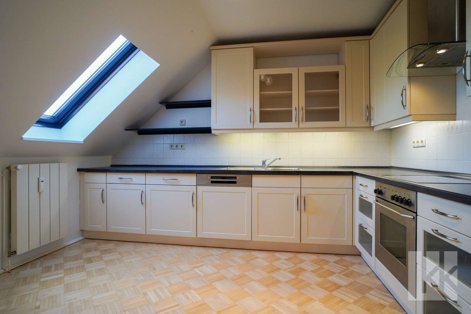 Die intelligent geschnittene Küche überzeugt mit kurzen Wegen und ausreichend Platz für gemeinsames Kochen und fügt sich harmonisch in das Wohnkonzept ein. Der Wohnbereich bildet das Herzstück der Wohnung: offen, lichtdurchflutet und über zwei Ebenen erlebbar. Große Fensterflächen und die offene Raumhöhe sorgen für eine angenehme, moderne Wohnatmosphäre.