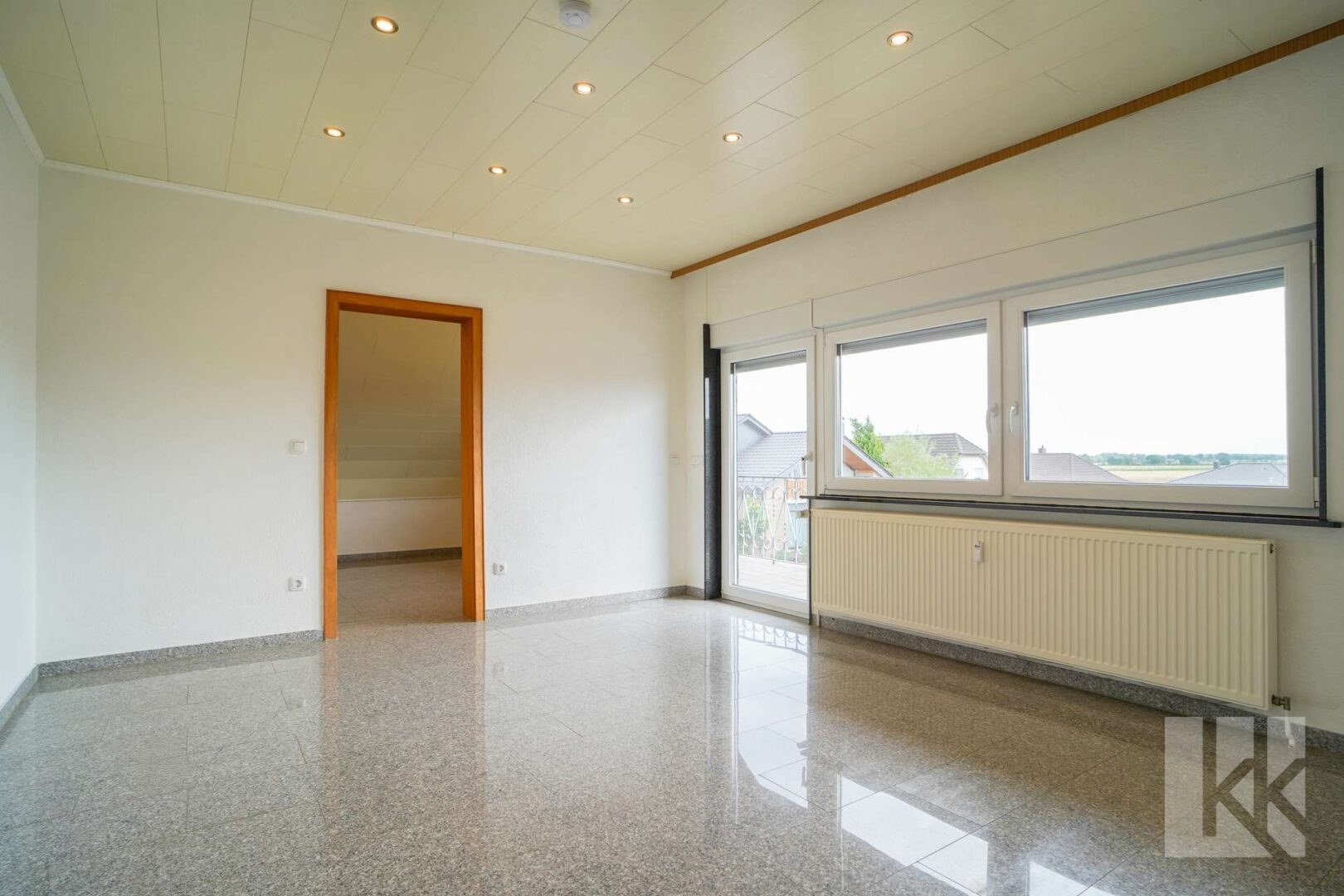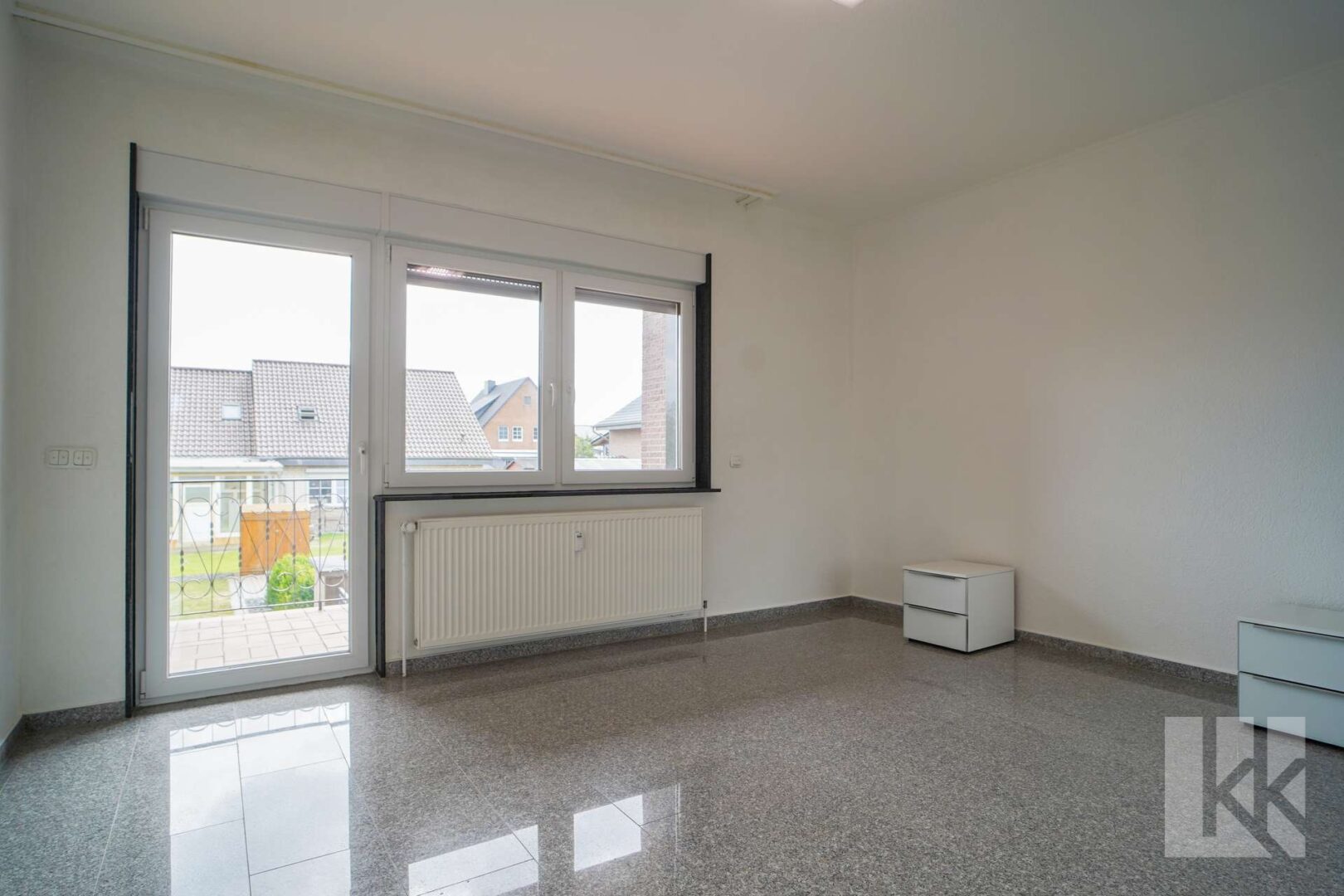 Im Erdgeschoss empfängt Sie ein helles, offen gestaltetes Wohnzimmer, das nahtlos in den Essbereich und die Küche übergeht. Von hier haben Sie direkten Zugang zur sonnigen Terrasse – ein wunderbarer Platz für entspannte Stunden im Freien. Zwei Schlafzimmer sowie ein modernes Duschbad vervollständigen das Raumangebot dieser Etage. Einer der Schlafräume verfügt zusätzlich über einen eigenen Balkon.