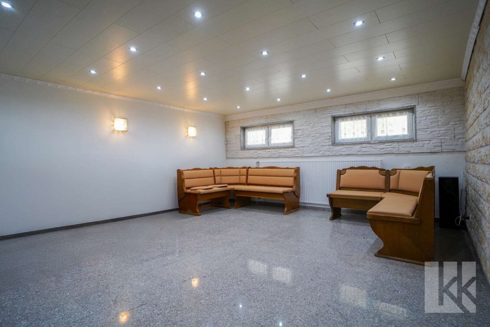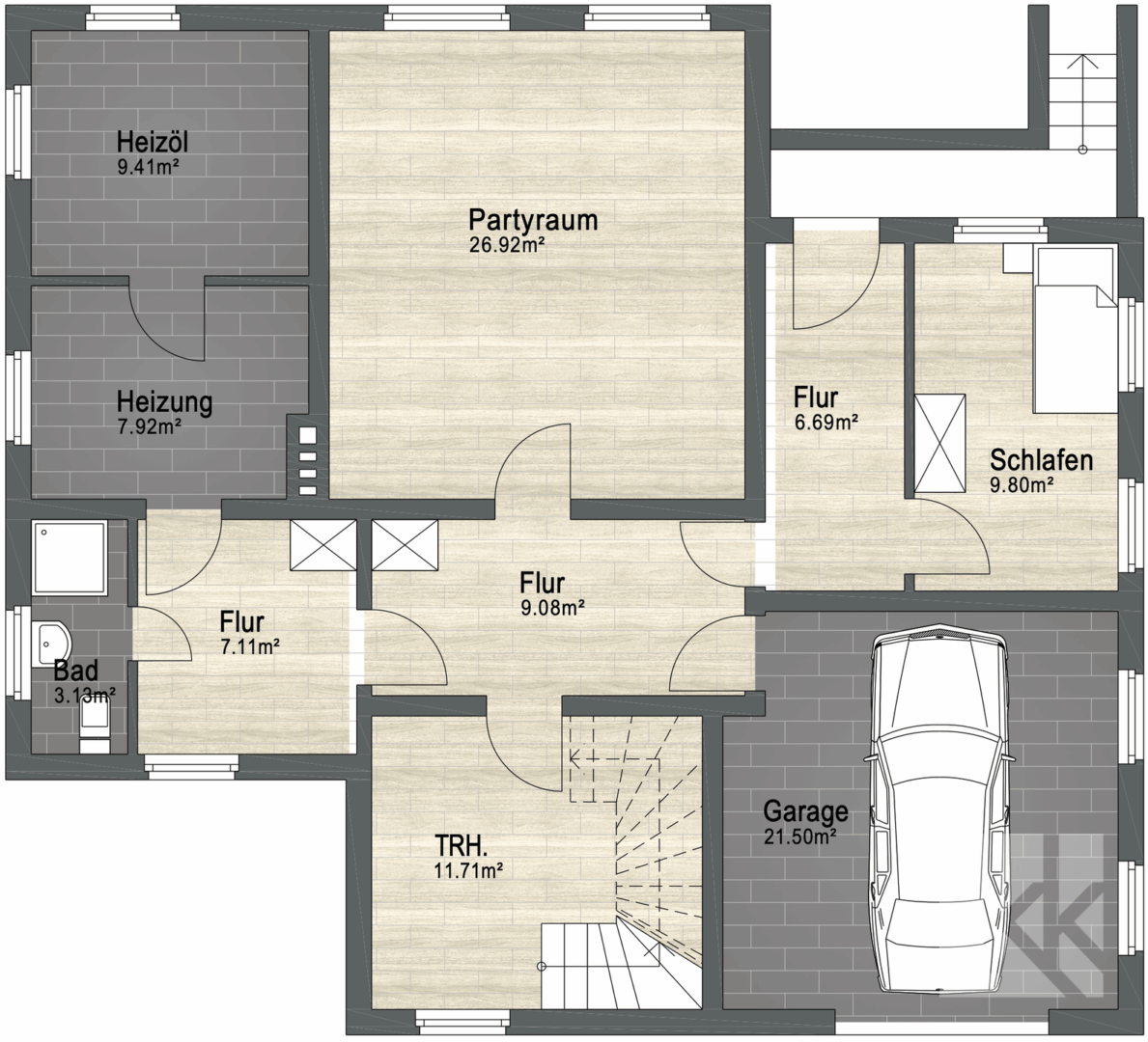 Im Untergeschoss befinden sich neben einer Waschküche, dem Heizungsraum und praktischen Abstellräumen auch ein großer Partyraum für gesellige Stunden. Besonders praktisch: Die Garage ist direkt ins Haus integriert und ermöglicht einen komfortablen Zugang.